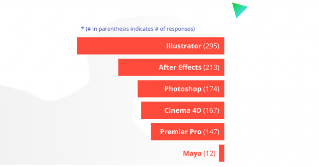 在軟體應用上,After Effects 仍是最大宗,也有 80% 的設計師都有使用 Adobe 的軟體。另外,網站也調查設計師們第二個常用的軟體,有 28% 人都說 Illustrator,畢竟在創作 MG 的過程中,還是會用到 2D 繪圖軟體,這樣的結果似乎不足為奇。