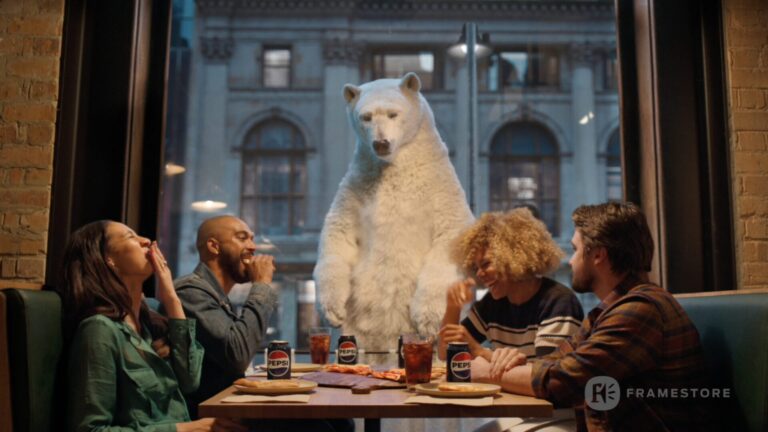 即便如此,百事的北極熊還需要經過重大改造。Ross 說:「我們視牠為一個人類角色。當牠直立時,重心會轉移,姿勢會放鬆。因此必須重做很多東西才能讓牠能自然活現。」團隊為此重建了身體結構,從頭開始創建新的毛髮,並設計一個能夠做出微妙、極具表演力的臉部表演綁定。