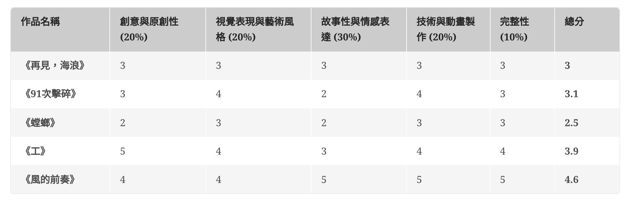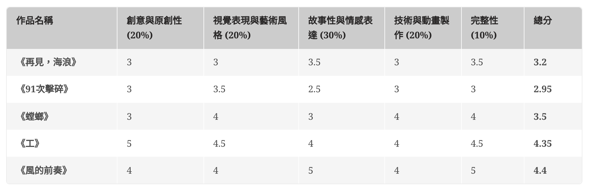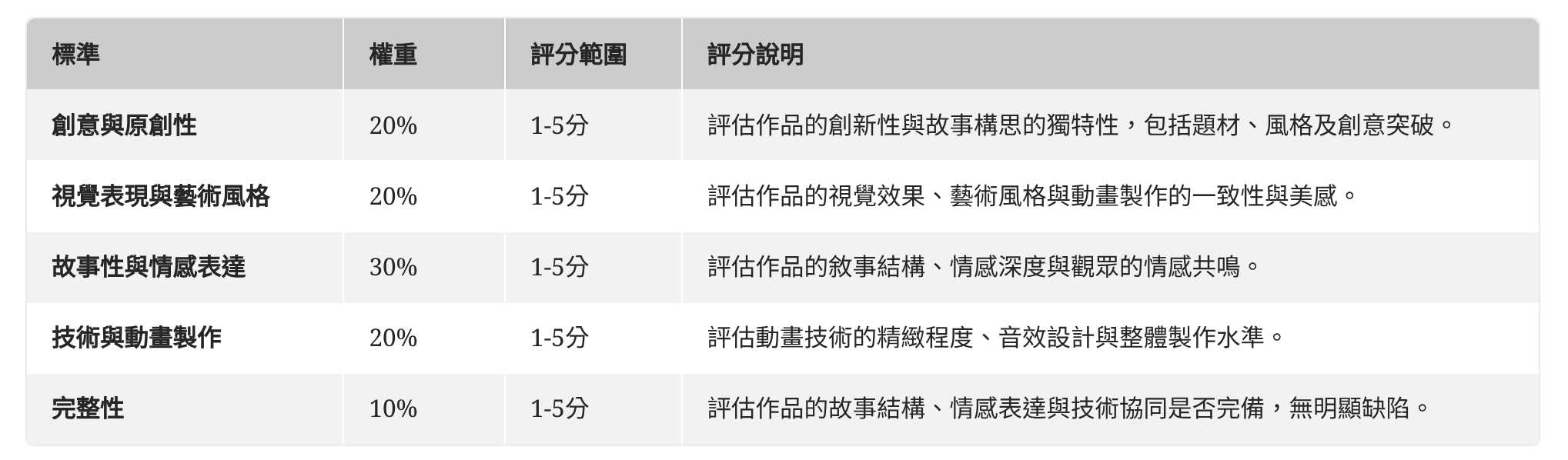 首先,安排五位編輯觀看所有入圍作品,確保每位編輯有充足的時間記錄觀感並參與討論。同時,確立五大評選指標,包括創意與原創性、視覺表現與藝術風格、故事性與情感表達、技術與動畫製作,以及完整性,並為每項標準設定相應的權重。