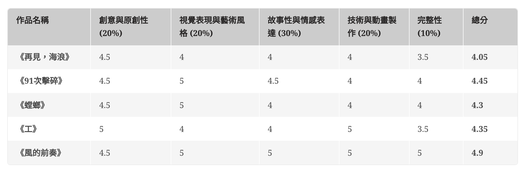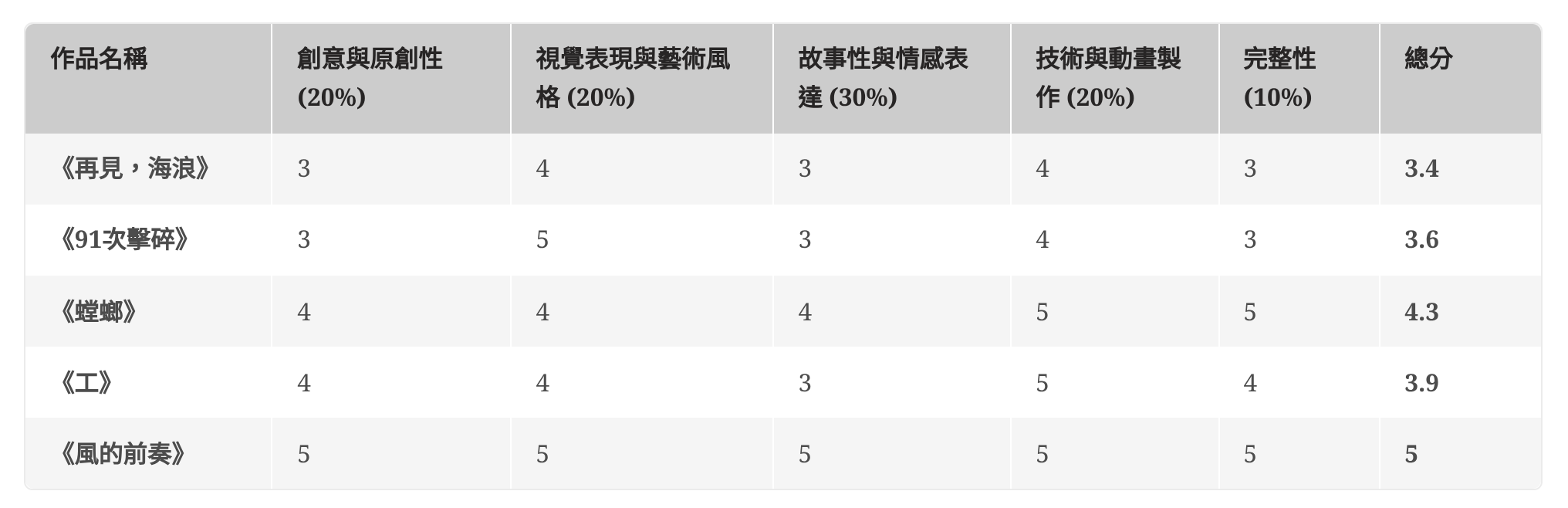 根據小螳螂、工の奴、海女、薩克斯風、碎碎平安(化名)五位編輯評分,最終由《風的前奏》以 4.72 分獲得最高分,接著是《工》4.25 分、《螳螂》3.75 分、《91 次擊碎》3.44 分,最後是《再見,海浪》3.42 分。