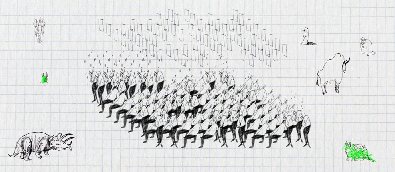 以音樂為起點發想短片,《工》是一次充滿創意的嘗試。畫面切換與音樂調性十分契合,以配樂快慢調動敘事節奏,令人想起《血觀音》開頭,說書人懷抱月琴開展敘事的概念。不過,也有編輯指出樂器的選擇雖充滿新意象,背後的文化意涵卻未有深刻展現,導致音畫的扣合仍有些許落差。導演的創作手法多元,如同在紙上即興塗鴉草寫,融合實拍與手繪,納入向量圖與物理算式概念,空間美學極具特色。片中逐漸疊加的元素,猶如人們在職場裡的寫照,逐漸在集體資本主義的規訓下成為「勞動機器」,讓觀者產生強烈的共鳴。因此儘管視覺元素看似抽象,情緒的表達卻非常精準。不論從創意性、視覺表達到情感層面,都令人印象深刻。