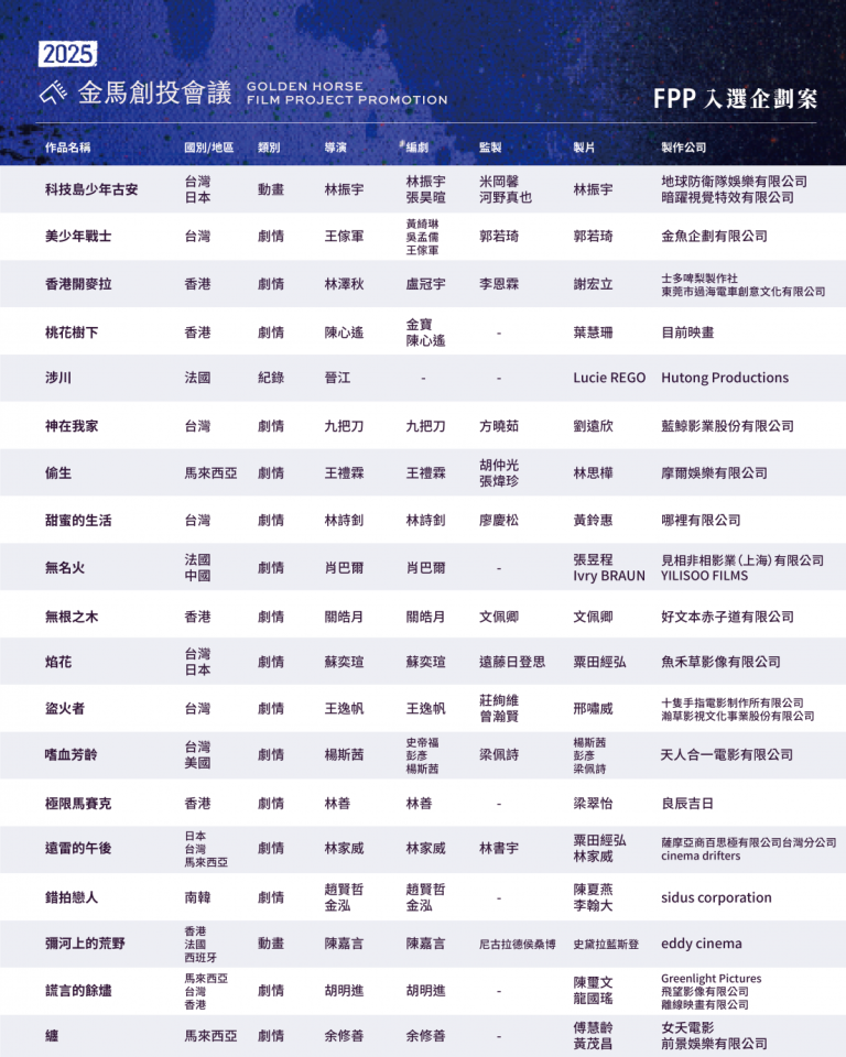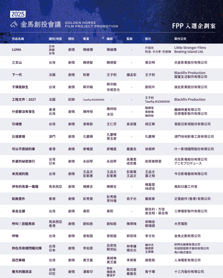 金馬創投會議公開所有類別的入選企劃名單。今年共有 50 件電影企劃入選,其中 38 件為全新企劃(FPP),12 件為已進入拍攝但仍在尋求資金或其他合作機會的作品(WIP),題材橫跨各種類型,呼應時代趨勢,多位金馬得主新案也名列其中。加上先前公布的 14 件入選劇集,本屆金馬創投會議共有 64 件影視企劃等待慧眼賞識,其中高達 22 件為跨國合製作品,創下歷年新高,也凸顯未來發展趨勢。