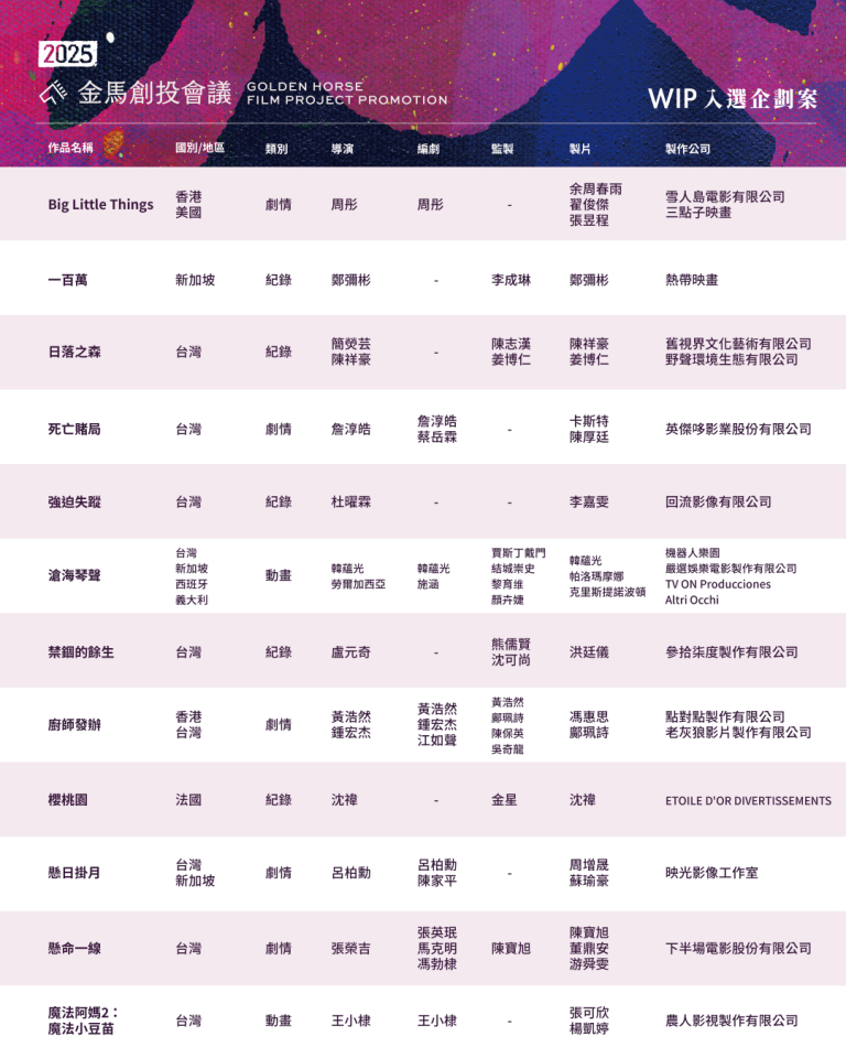 動畫片也不遑多讓,不僅台灣動畫傳奇《魔法阿媽》續集《魔法阿媽2:魔法小豆苗》即將問世,還有集結四地合製、參與安錫影展市場展的音樂史詩《滄海琴聲》。其餘企劃包含《下半場》名導張榮吉講述洗窗工受困摩天樓、險象環生的《懸命一線》;出身金馬電影學院的呂柏勳改編得獎短片的《懸日掛月》;《化外之醫》導演詹淳皓讓落魄棒球員涉險救父的《死亡賭局》。香港代表則有《緣路山旮旯》導演黃浩然結合美食與交友軟體,以四頓飯談出浪漫戀曲的《廚師發辦》,以及周彤探討親密謊言的女同志家庭劇《Big Little Things》。