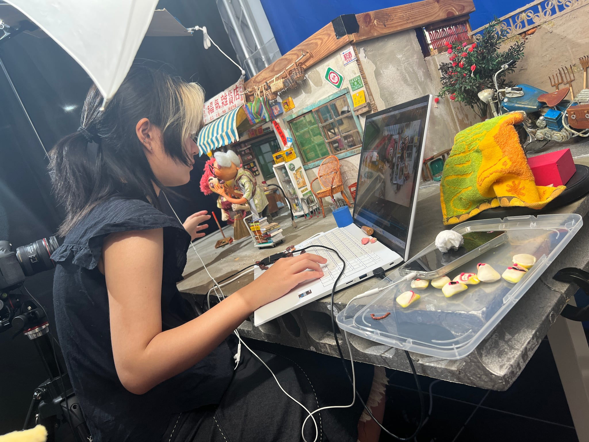 過往小弦總是笑說,停格動畫集傳統動畫與實拍電影的缺點於一身,背後製程比冰滴咖啡還慢。《我是陳派派》每一秒畫面至少要由 10 張照片組成,為了縮短製程,團隊在宜蘭工作室開設了 6 座攝影棚。她停頓道:「這時問題就來了,每一座攝影棚都需要運用到人偶,因此主角的數量其實不夠。」