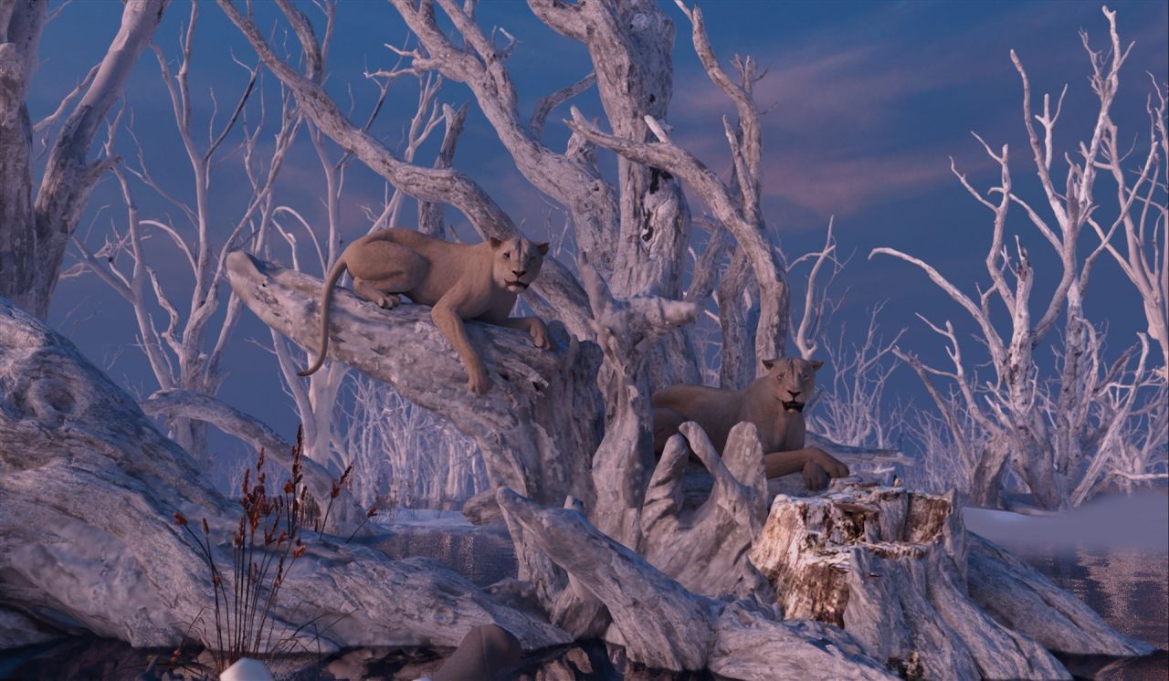 - 為了模擬逼真的獅子鬃毛,每個角色需要 40,000 至 80,000 條動態曲線,並為不同的天氣和物理條件設計了自訂預設。長鏡頭的彩現,每次迭代可能需要長達一週的時間計算,最終的毛髮暫存檔案大小超過 800 GB!