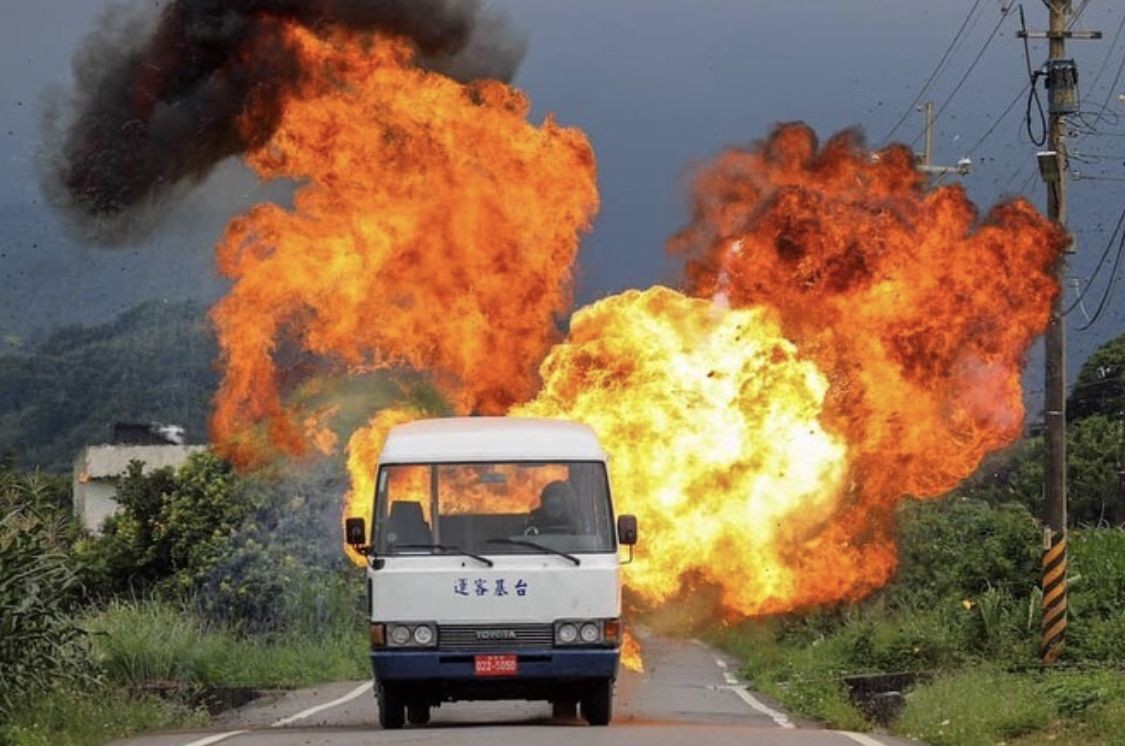 而在中國,除了少數經過審查允許的影視作品,能拍攝爆破特效的少之又少,遑論現場特效的專業系統。2019 年澤影映像受邀參與遊戲〈絕地求生〉的一系列廣告,除了臺灣之外,也跑到中國敦煌、北京、上海等地拍攝。「當時是乾燥的十月,很容易有靜電。我們所有的原物料都要從北京的中影送到敦煌,一台小麵包車開了兩天一夜,到了以後一打開後車廂,將近六百條的電火頭全部外露,甚至碰到車廂的絨布地毯。」回想起來,呂革進仍餘悸猶存:「已經裝好的火藥放在沙漠野地一整晚沒關係,但要買六、七公升的汽油卻需要公安局公文和專人陪同。」本末倒置的狀況讓人對當地現場特效拍攝的安全問題無法放心。