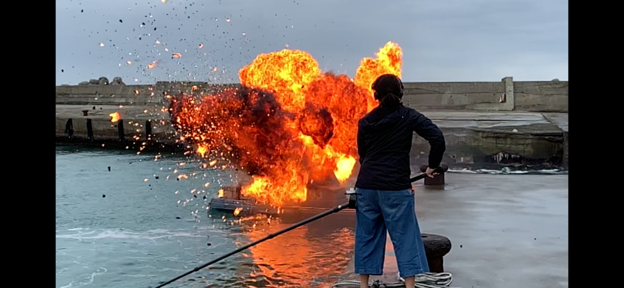 想起那天,呂革進仍哭笑不得。他們將火藥藏在木板上,呂革進穿著救生衣游到定點以繩索固定。然而,港內的風浪大到他游了五分鐘前進不到十公尺,只好向袁緒虎導演帶領的水下攝影團隊求助。正當他們苦惱之際,陳銘澤突然騎著水上摩托車從海的另一端而來,才完美解決了這個難題。不過回去之後全員感冒,那又是另一個故事了。