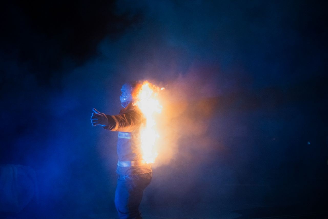 針對不同的現場特效,演員們也需要相對的前期訓練。《火神的眼淚》是個複雜的案例,除了飾演消防員的演員們要衝入火場,需要穿戴沉重的消防裝備、呼吸器,還有受困等待救援的民眾,以人身火效處理。不過絕大部分的人身火效都是專業替身上場,在萬全的準備之下,火燒人身的持續多久取決於演員的心理狀態,絕不勉強。也有過演員在舞台劇、互動展演的情境下,隨著演出經驗增加,一次比一次忍受得更久。