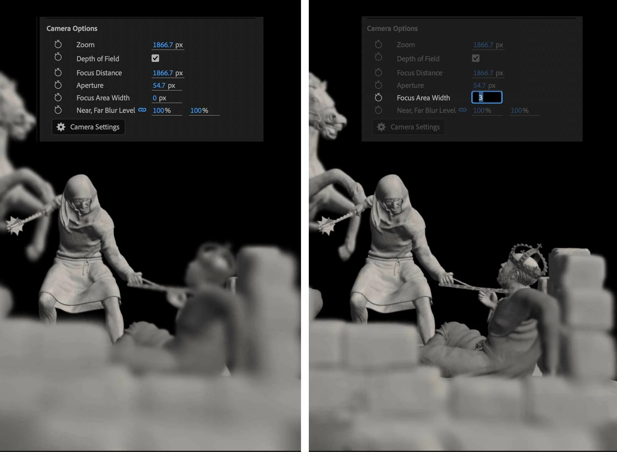 - 對焦區域寬度(Focus Area Width): 簡單來說就是讓使用者可控制「景深區域」的厚度。例如在微縮模型場景中,若實體物理的焦距過淺,導致部分關鍵物件變得模糊,則可透過此功能讓多個臨近的物件同時保持清晰。