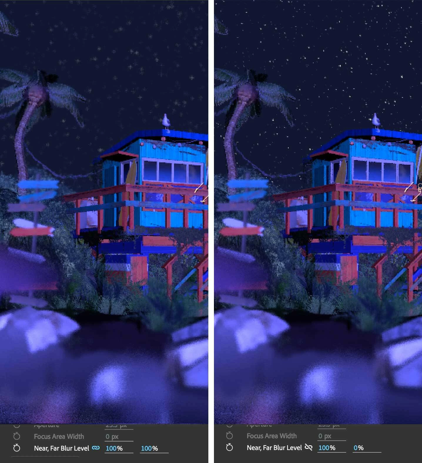 - 近景、遠端的模糊等級(Near, Far Blur Level): 設計師可獨立調整焦平面之前或之後的模糊強度。例如,將「遠端模糊」設為 0,即可模擬「無限遠對焦」的效果,同時保持前景物件的散景效果。