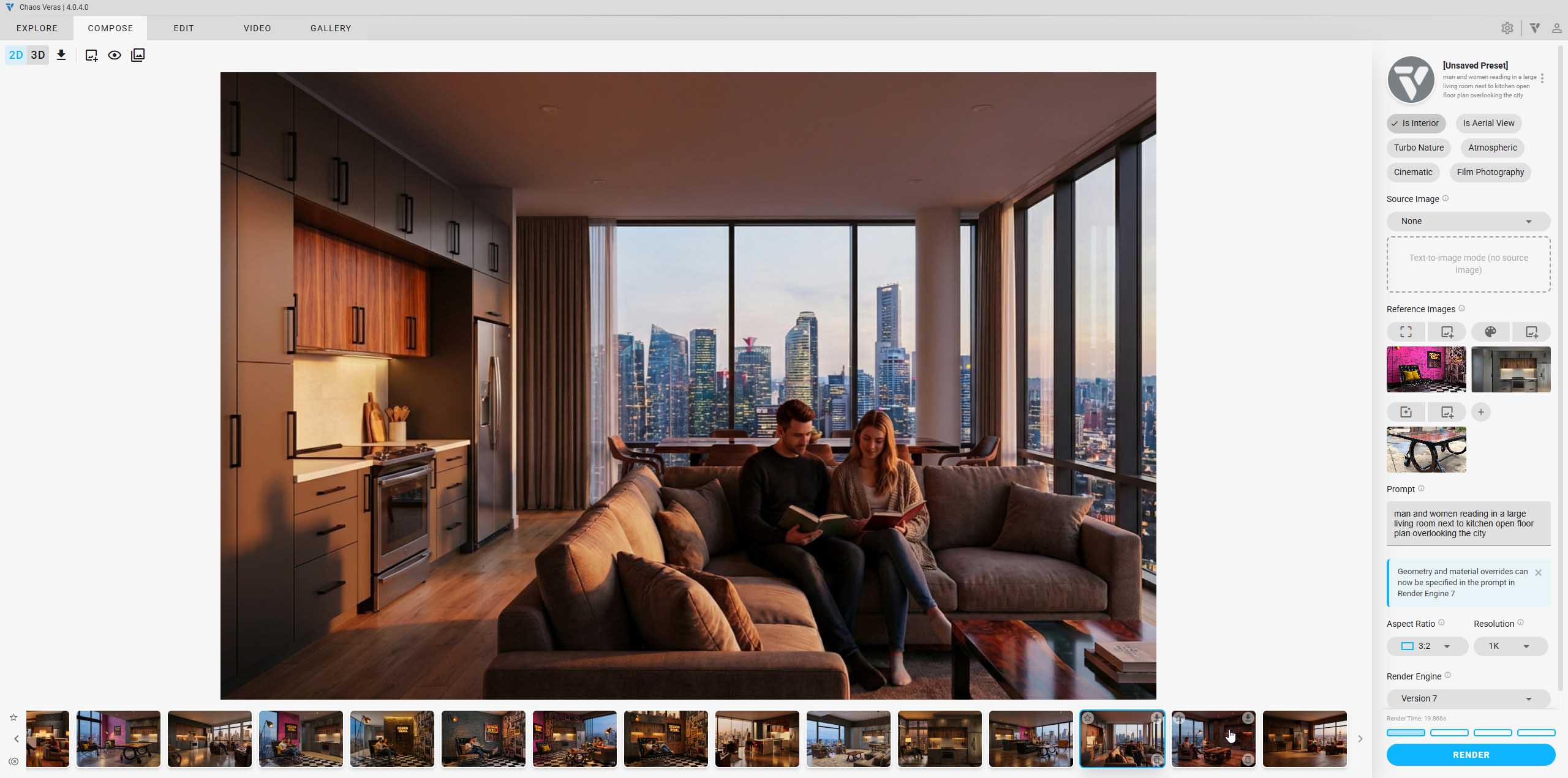 Veras 4.0 引入的全新算圖引擎 Render Engine 7 是本次更新的靈魂。這款基於 Nano Banana Pro 技術的 AI 生成器,能提供更清晰、寫實且更穩定的影像輸出。過去 AI 生成常出現的線條扭曲或結構錯誤,在 4.0 版本中幾乎消失。這使得算圖結果更具可靠性,能直接用於正式的設計工作。