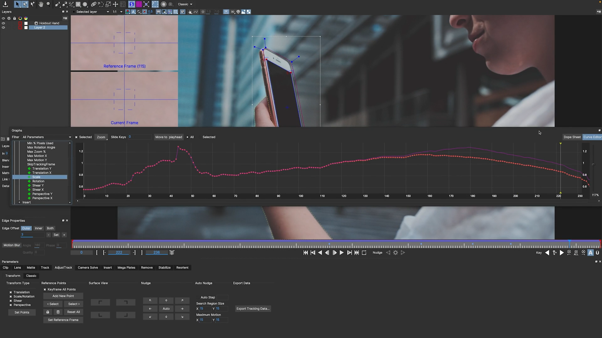 協助以視覺化的方式檢視追蹤、Roto 或相機解算中可能存在的任何問題,讓使用者對追蹤中的參數都擁有更細緻、精準的控制。全新架構的核心與介面,與 Dope Sheet 更緊密整合,更新版本也能夠編輯 3D 相機的曲線資料。