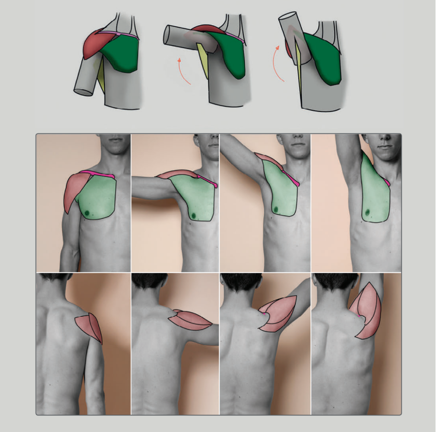 A pose 與 T pose 的選擇多取決於動畫工作室的製作流程。楊顓瑋分享,業界在綁定角色時多以 A pose 為主。如果選擇 T pose,從解剖學角度來看,當大臂關節旋轉超過 90 度,這時候主要的旋轉發生在鎖骨,以及肩膀並不是放鬆的狀態,三角肌跟胸大肌都會拉伸。在動畫中,角色大多時候手臂是自然垂放在身體兩側,所以若是以 T pose 去製作模型,要特別去修角色手臂垂放時肩膀、胸的形狀,會增加很多製作內容。