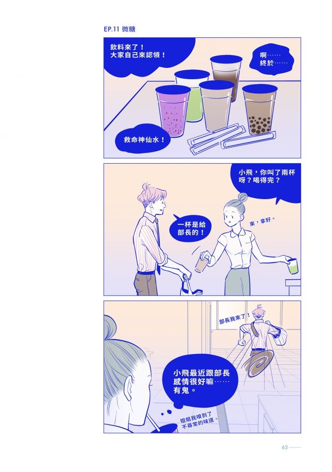 在《Day Off》中,樂天單純的「花小飛」和內斂拘謹的企劃部部長「石冬雲」秘密展開交往,如同單元劇般每一話 7 至 20 格的篇幅,甜甜的情侶互動引起許多上班族共鳴。