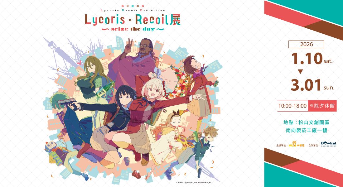 「Lycoris Recoil 莉可麗絲展~seize the day~」首次海外移展,台北站將於松山文創園區登場!本次展覽完整重現動畫中的經典場景,並以沉浸式投影與立體造景,帶領觀眾走入千束與瀧奈的任務與日常。最後也規劃台灣限定區、展期限定周邊,讓粉絲在收藏與體驗之間留下最完整的回憶。