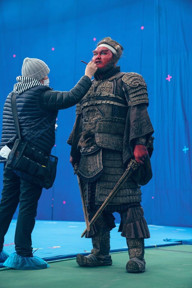 此外,讓人印象深刻的還有身高超過 12 公尺的魔家四將,他們在戰場上施展神通、鎮壓全場。而這些角色的背後,則是製作團隊的極致匠心。魔家四將採用「真人拍攝」+ 特效化妝技術,演員需全臉特效化妝,並配戴假牙、全瞳隱形眼鏡與假皮手套,單次妝容製作就需超過 4 小時。為了確保魔家四將與其他演員能夠無縫互動,劇組甚至特別搭建微縮模型,並運用 3D 掃描技術,使場景比例達到精準匹配,塑造出巨人與凡人之間的落差,產生震撼的壓迫感。