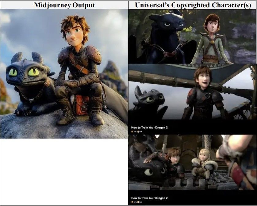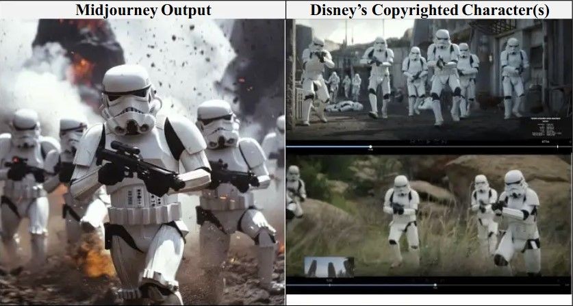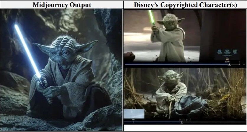 這些影視公司認為,Midjourney 在未經授權的情況下,利用網路下載圖片、影片素材或爬蟲擷取資料等方式來訓練 Midjourney,再提供服務讓使用者可輕易產出這些侵權的圖片。在指控文件中,他們整理出多張有關版權侵害的證明。包含《星際大戰》尤達、帝國風暴兵、史瑞克、鋼鐵人、《玩具總動員》的巴斯光年,《馴龍高手》等,不可勝數。