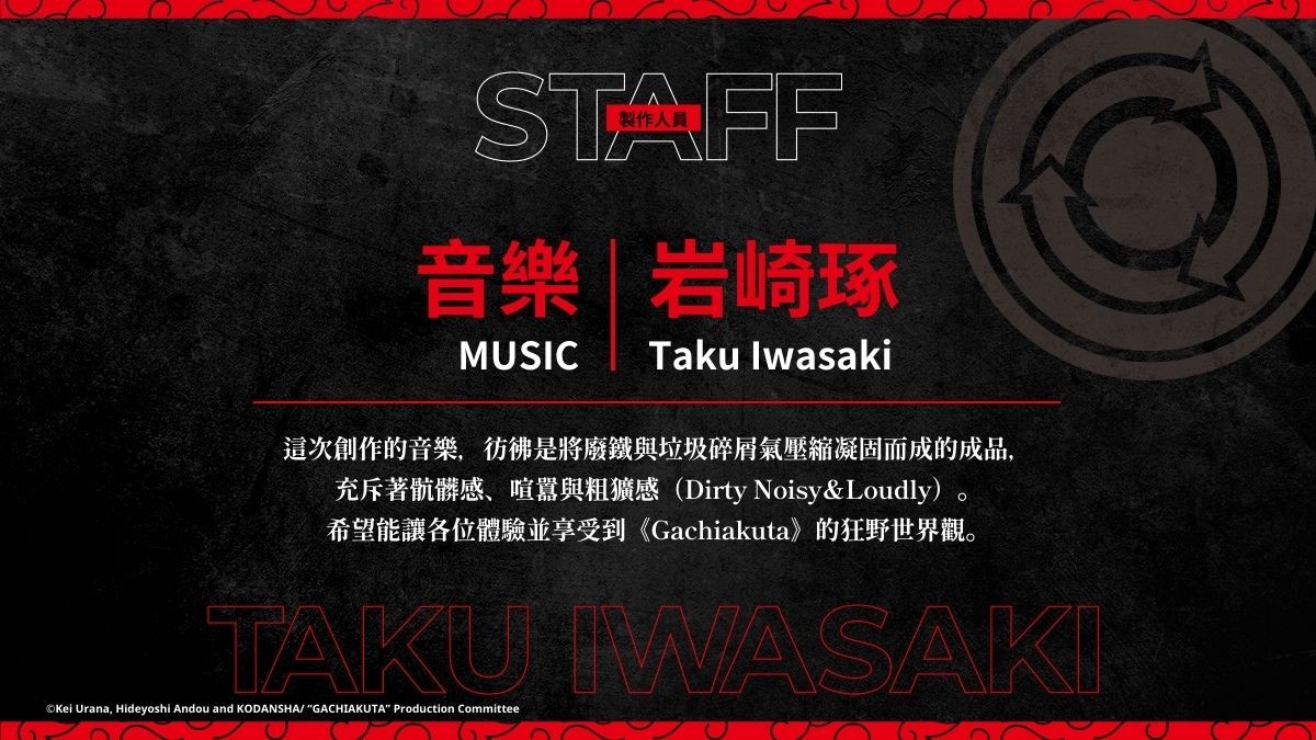 此外,本作音樂將由活躍於多領域的知名作曲家岩崎琢擔綱。近年他亦參與《文豪 Stray Dogs》、《新·假面騎士》等各類型作品配樂,本次將以各種的音樂為《Gachiakuta》的異色世界觀注入多層次的色彩!
