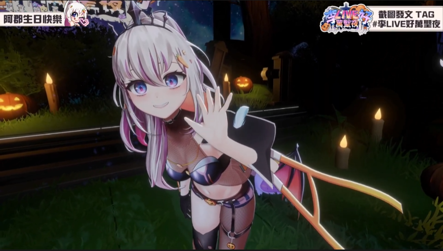 年度最狂 VTuber 3D 綜藝「李 Live 好萬聖夜」是十六月首次 3D 演出,原本想為自己的「初登場」留下美照,最後卻被粉絲集體惡搞。原來,演出設計了專屬的舞台互動機制:粉絲只要在聊天室留下特定貼圖,即可在演出過程中觸發舞台特效。讓十六月在舞台上長出「紅鼻子」,讓想拍美照的她哭笑不得,互動場面瘋狂又可愛。除了紅鼻子之外,主辦方還設計了流星、好感增加、下雨、大便等各種立體趣味貼圖,讓粉絲與藝人之間的舞台互動性倍增,為這場 6DoF 演出創造出獨一無二的混亂喜劇效果。