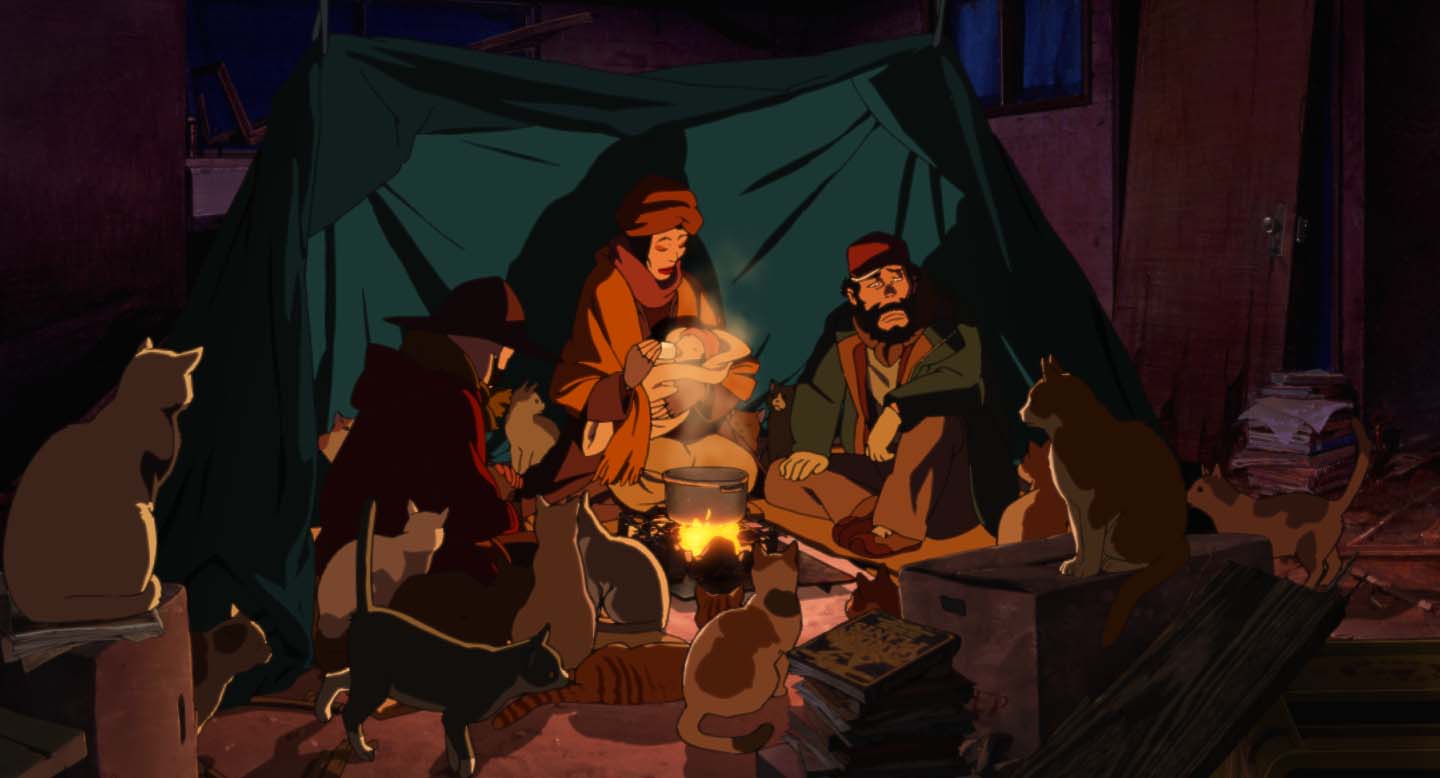 此外,今敏也加入了有趣的性別改編,從《三位教父》「三位男性」變為一男一女、和一位跨性別者的組合。曾經是變裝皇后的美由紀,和曾為人父的阿銀收留了翹家少女小花,彼此在破爛的帳幃中相互依靠,組成一幅微小的家庭群像。