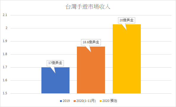 在下載趨向飽和的狀況下,2020 台灣手遊市場的總收入卻不減反增。根據 App Annie 提供資料,2019 年的數字為 17 億美金,但 2020 年前 11 月已經達到了 18.6 億美金,預估 2020 年有機會突破 20 億美金的總收入,年成長達 17%。