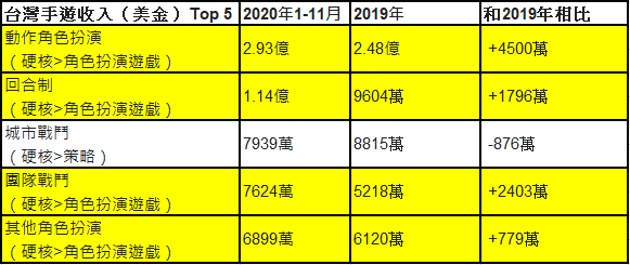 這其中,下載量排行的前五種類別,「超休閒遊戲的解密益智類別」為 2020 截止到 11 月最受歡迎的品類。而在重度品類中,「角色扮演 RPG」還是台灣玩家最主流的類型,在前五中佔了兩個品類。