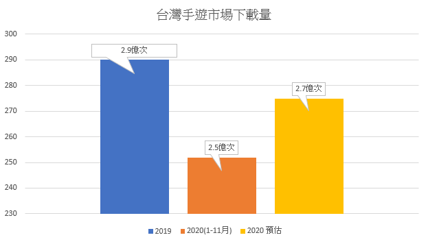 2020 當歐美受到 Covid-19 的影響,而大規模封城的情況下。台灣則因為防疫有功,民眾的日常生活沒有太大改變,這也造成了遊戲市場並無明顯的紅利產生。根據 App Annie 提供資料,台灣手遊總下載量 2019 年 2.9 億次,2020 年 1–11 月為2.5 億次,也就是說,台灣手遊市場並沒有因為疫情拓展了市場的人數,市場競爭已經趨近飽和。