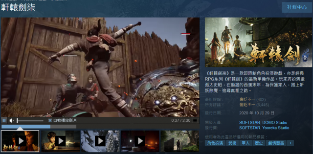 除此之外,同樣採取 IP 策略的還有大宇,但研發已經幾乎採取委外製作了,不管是《仙劍奇俠傳 — 宿命》、《軒轅劍:劍之源》等手遊,都採取研發委託中國廠商的策略。唯一由台灣製作則為 DOMO 工作室的單機作品《軒轅劍柒》,雖然畫面上獲得了不錯的迴響,但在 Steam 上得到了褒貶不一的評價。