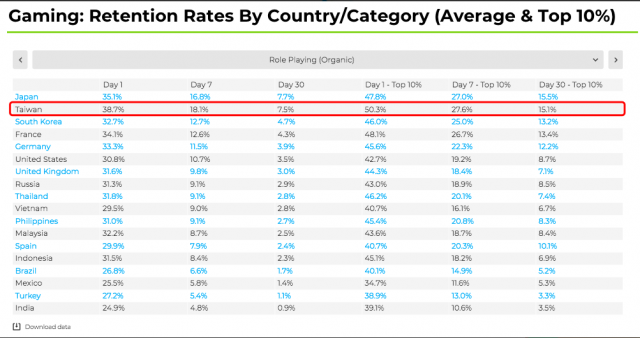 在我今年三月所揭露的 2019 年 Appsflyer 留存報告中曾指出,台灣人最愛的角色扮演類遊戲,在廣告買量上的30日留存是世界第四、而自然流量的留存則是世界第二;而如果看所謂前 10% 頂尖產品的自然流量,其 30 日留存更高達 15%。另外,不管是好遊戲或是一般的遊戲,在台灣自然流量的留存,幾乎都是廣告流量留存的2倍。所以如果在台灣做遊戲,採用大規模的電視廣告或是社群來獲取自然流量,是絕對必須的。