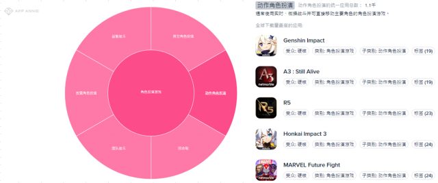 玩手遊的人口沒成長,但收入增長,代表每位玩家付更多錢了,而這些增長全集中在角色扮演這品類中,其中成長最高的品類就是「動作角色扮演」(可參考),如 A3、原神、天堂 M、RO 新仙境傳說等遊戲。