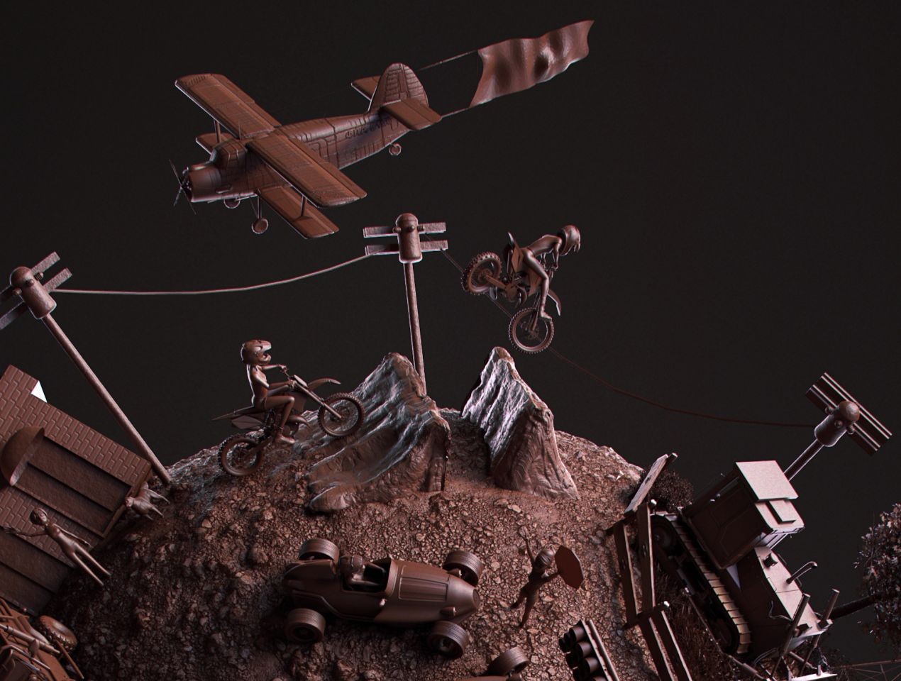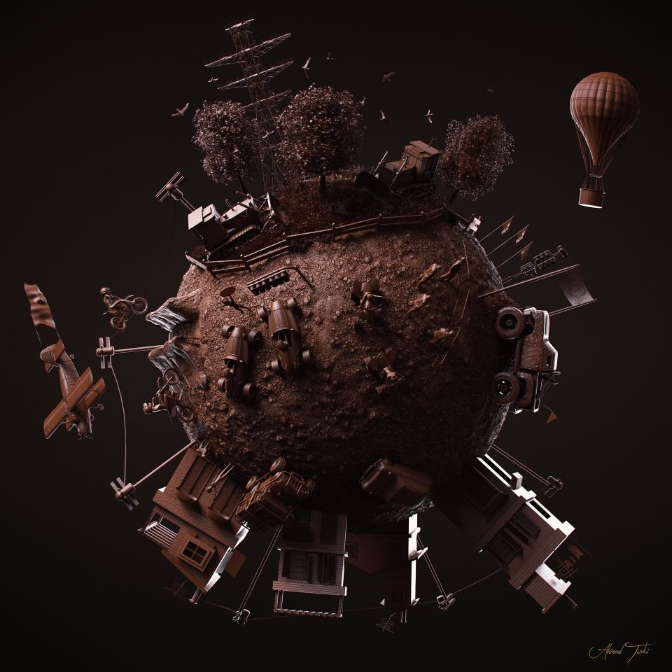Ahmad Turki:此作品的概念是世界各地正在發生許多事,每個人都忙於關注他們所處的地方,而沒有注意周圍所發生的事情。例如運動時,你會試圖觀察周圍樹木是如何被砍伐,且人們是如何威脅著大自然嗎?因為此作品有很多元素要放置,所以將這些事物放在球體上是一大挑戰,我必須不斷地調整以確保所有物件都能放入。至於材質部分,我想做一些不同的東西。不是將所有物件製作不同的紋理,而是製做一種看似美味可口的材質呈現整體外觀。至於燈光,我使用了 Skydome 燈光,並在後方使用較強的輪廓光。