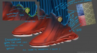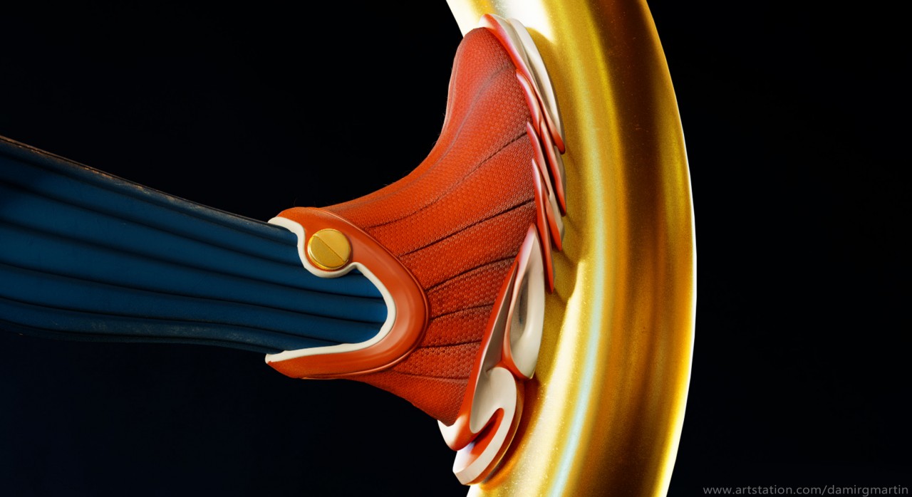 創作方式的不同,當然會改變其中的一些細節,當你繪製 2D 概念圖時,只需要用一個視角來創作,但到了創作 3D 模型上,反而要讓角色在不同視角,都是好看且富有啟發性。若要將索尼克從概念圖轉換到最終的 3D 模型上,最大的重點是必須依照現實世界中生物科學做變化。例如,索尼克所穿的配件,必須如真實世界一般,是具有功能性的。如果你仔細看她的鞋子,你會發現是用 Sonic 這個單字打造的,與此同時,鞋子具也備真實世界鞋底的樣貌,讓索尼克是能真的穿鞋子跑步。我曾想像,若能用 3D 列印將鞋子給印出來,我相信會有粉絲想購買與索尼克一樣的鞋子。
