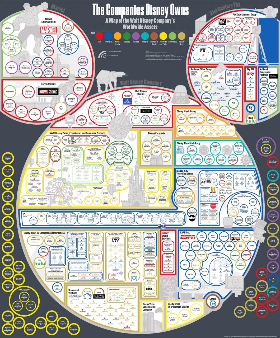 今年 3 月中迪士尼終於與 21 世紀福斯 (Twenty-First Century Fox) 正式合併,福斯旗下所有影視娛樂品牌與資產也歸迪士尼所有。而外媒 Cartoon Crew 就製作一張圖表,帶大家一窺這個娛樂帝國的新版圖。