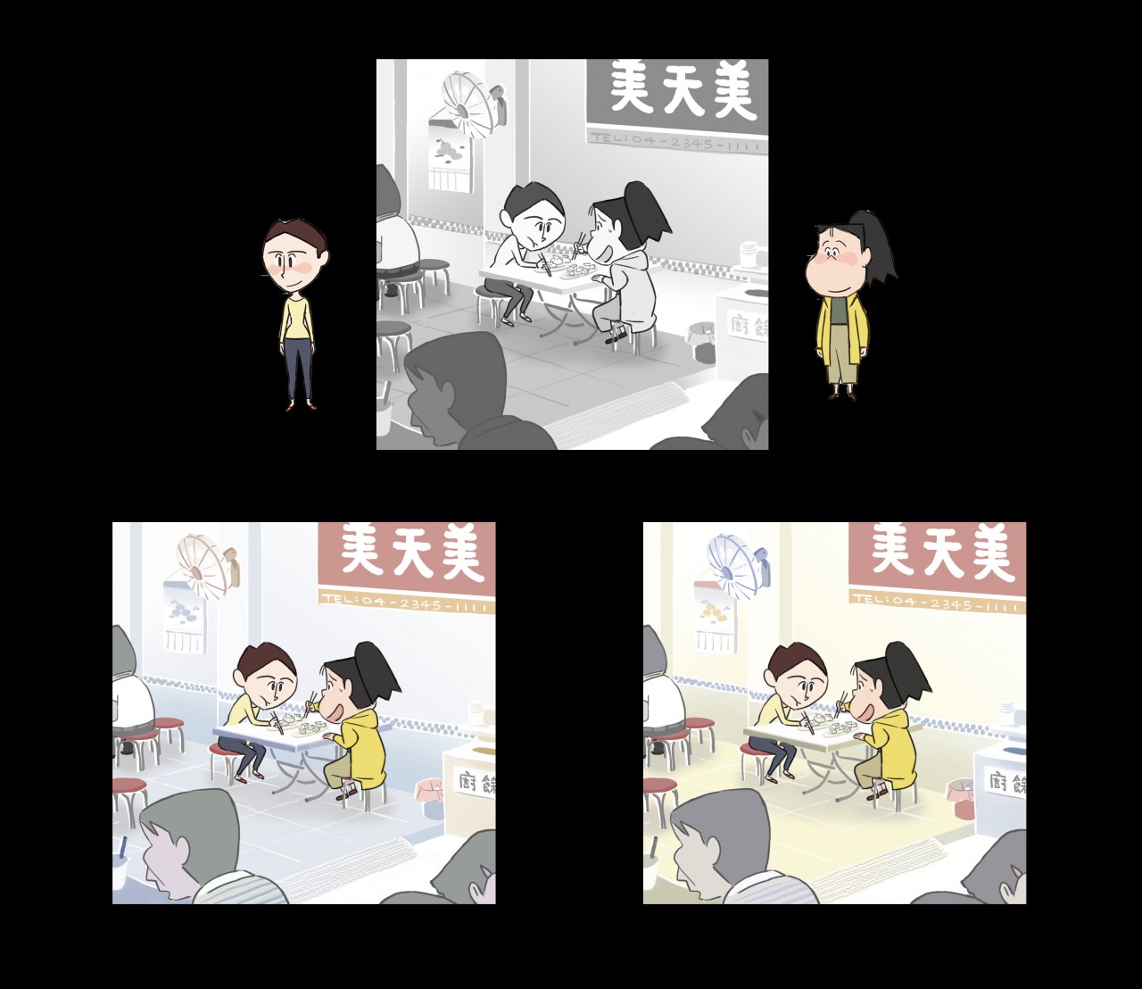 動畫是由法國開發的 TV Paint 完成,從分解動作到清稿上色一舉包辦,後期合成主要是使用 After Effect,聲音部分使用的是聲音剪輯軟體 Pro Tools,最後將全部的檔案輸入至 Premiere 剪輯輸出。過程分解如下: