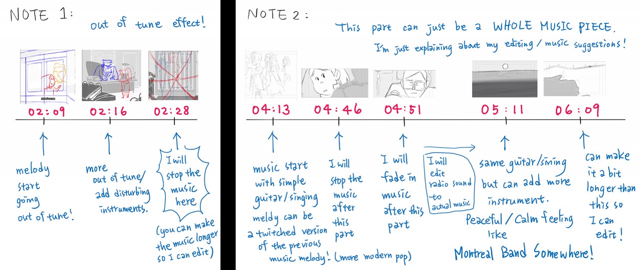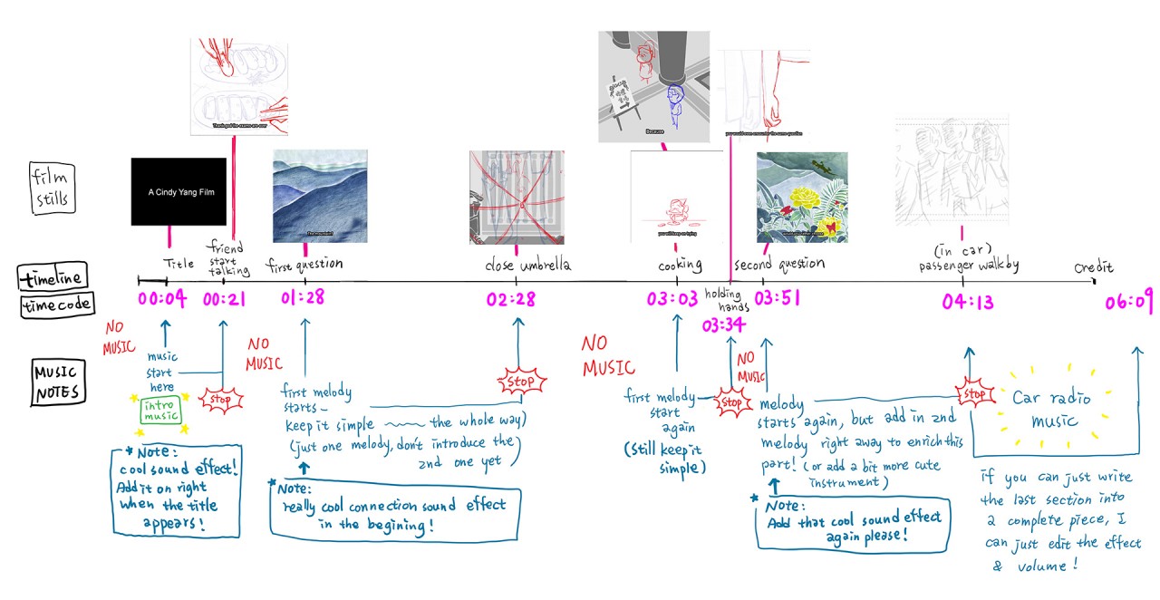 而配樂部分則是另一個挑戰,在還沒回到美國的暑假,有位英國的樂團作曲家聯絡我,希望有機會合作。我聽了樂團的歌曲後很喜歡,覺得很適合,並沒有想這個樂團有多少電影配樂經驗,就答應他的合作邀請。因為對方在英國,時常要因應時差來回聯絡,更增加了溝通的困難度。而我對配樂也非常要求,來來回回我大概要求修改了不下數次,還畫了時間圖表解釋,最後事實證明其實視訊解說比較快,而且解釋越精確越好。哪些樂器的聲音比較適合、或許這部分可以更多的弦樂,或是前一段音樂的延伸,只是更加簡單、放慢。每次的溝通都更加邁向理想中的模樣,這種感覺其實是很令人興奮的。。