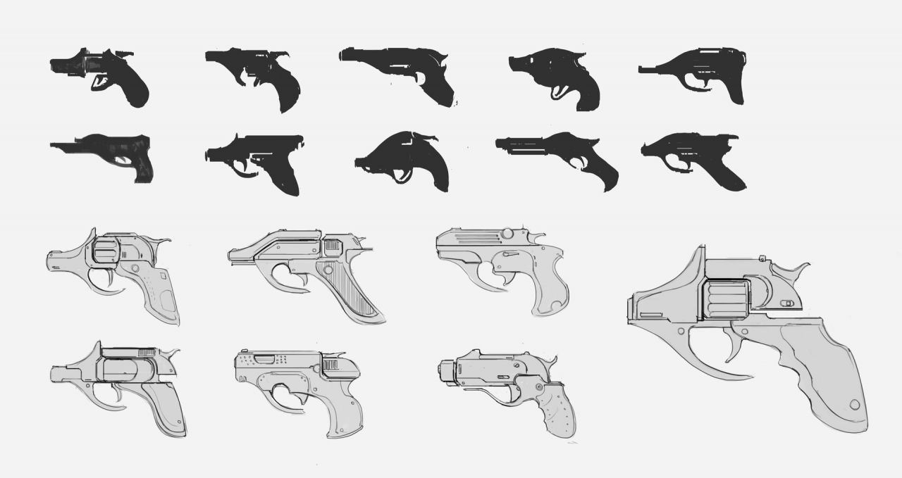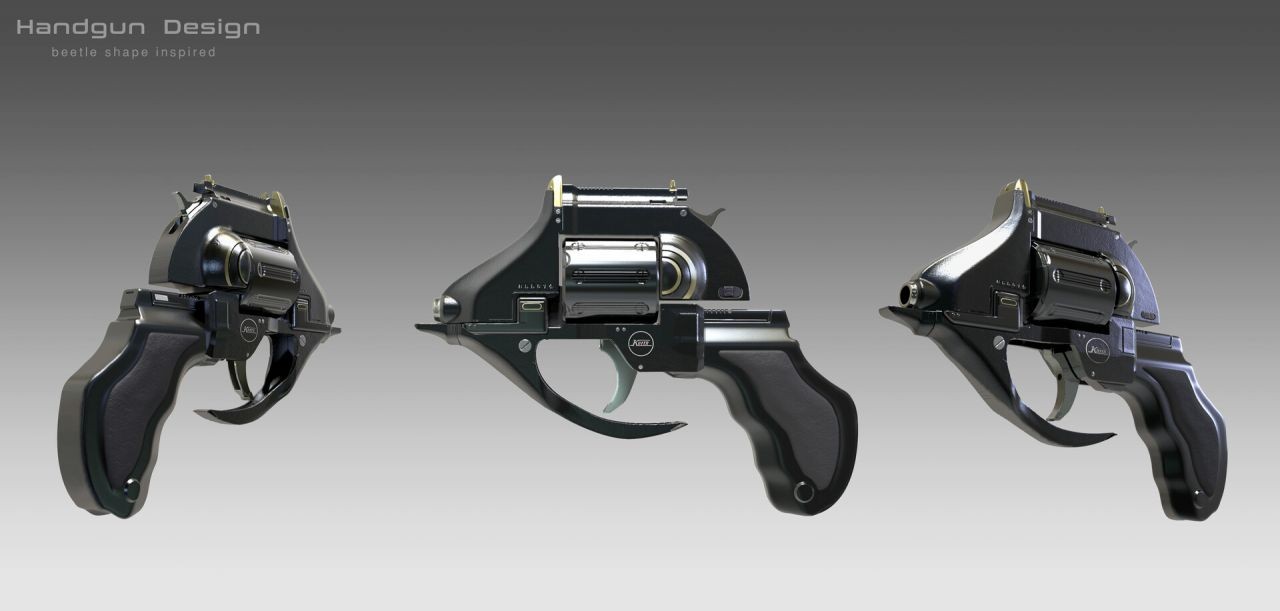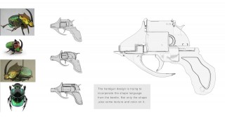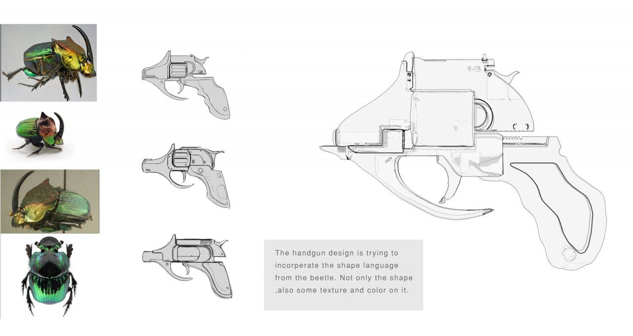 Harry Pon:最印象深刻的課程是「造型語言」,它讓我在發想概念、打造酷炫設計有著非常顯著成長。這堂課主要教授如何在生活中取得造型、外觀設計的靈感,並應用、轉化在你所要設計的人物、場景、物件上。舉例來說,《Handgun weapon design》是以昆蟲外觀的曲線輪廓與頭頂尖角為基礎,轉化成流暢曲線與尖角形狀、充滿個人風格的手槍。通常在轉化「造型語言」上,有兩種方式,一種是取用參考對象的外型特徵,像是捲捲的尾巴、細長的耳朵等;另一種是取用參考對象的行為特徵,像是蜘蛛會噴絲、壁虎會斷尾等。