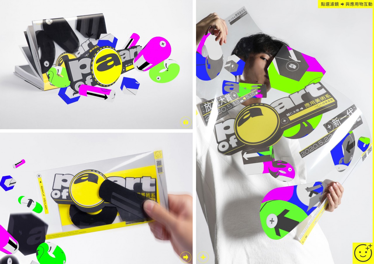 陳泓宇:今年主題名稱叫做 「paart_of」,概念是「加入我們,共同激發出參與的形狀」,於是為了傳遞「參與」的精神,我們使用在社群平台流行的 AR濾鏡,作為主視覺載體與傳播媒介。觀眾可以透過 Instagram (以下簡稱 IG) 的功能,直接與主視覺進行拍攝、互動,並藉由分享邀請更多人參與,截至目前已有 1 萬次的互動量,30 萬次的曝光。而這些社群影片都會成為輔仁應美畢業展形象的一部份,逐漸形塑出活潑、好動的品牌調性。