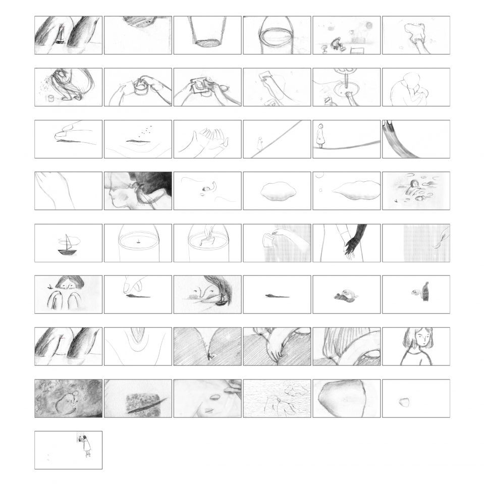從房間牆壁脫落,女人等著牆面風乾,撫摸身上傷口,傷口變成一座島嶼,女孩捧著水,而水中倒影是那座島嶼。一連串的動畫轉場令人印象深刻,導演表示:「有時候我們會不知不覺陷入某種情境或狀態,像是發呆看著某樣東西出神,神遊到某個地方去,回過神才驚覺事發經過。如同影片裡的女孩並沒有察覺到,像是一種無法抗拒的狀態,我覺得這是回憶讓我覺得最可怕的地方。」導演表示當初在《無瑕》時就有帆船這個元素,帆船代表著讓她心碎的戀人,一開始思考要使用何種船才能劃傷女孩大腿,畫了許多造型,但最後決定以更直接、單純的方式呈現,所以選擇帆船,其頂端處銳利的意象會讓人與危險產生連結。島嶼是在《水中的女孩》才有的延伸概念,一開始畫疤痕,看著看著就直觀地認為是一座島嶼。影像藉由女孩傷口痊癒的過程,來表達一段感情的療傷期,影片中女人內在的時間意識是緩慢的。導演認為療傷速度因人而異,但其中一定都有糾結,消化情緒是一個無法加速的過程。《水中的女孩》透過觀影體驗的緩慢感,讓觀眾理解療傷的慢,這也是為何女孩總是緩慢地刮掉壁癌及補土,而非俐落地完成。