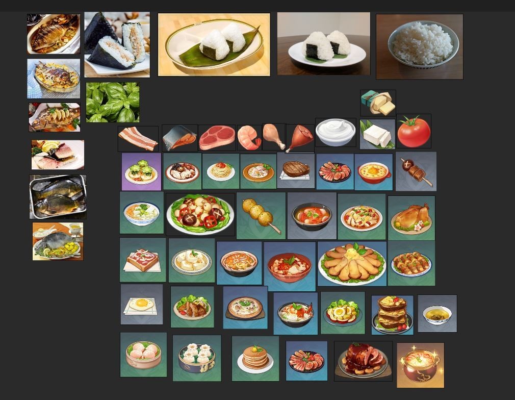 Malte:創作的概念源自某次玩《原神》時的一個念頭,由於該遊戲多樣、強大的煮菜系統,讓我對遊戲中的食物感到印象深刻,因而激發自己創作與眾不同的 3D 美食。但我從未創建任何 3D 食物,因此我擷取遊戲每個食物、食材的圖像,並針對質地和形狀進行分析。為了蒐集更多參考圖像,我使用免費工具「PureRef」將其整理成參考面板(圖 1)。
