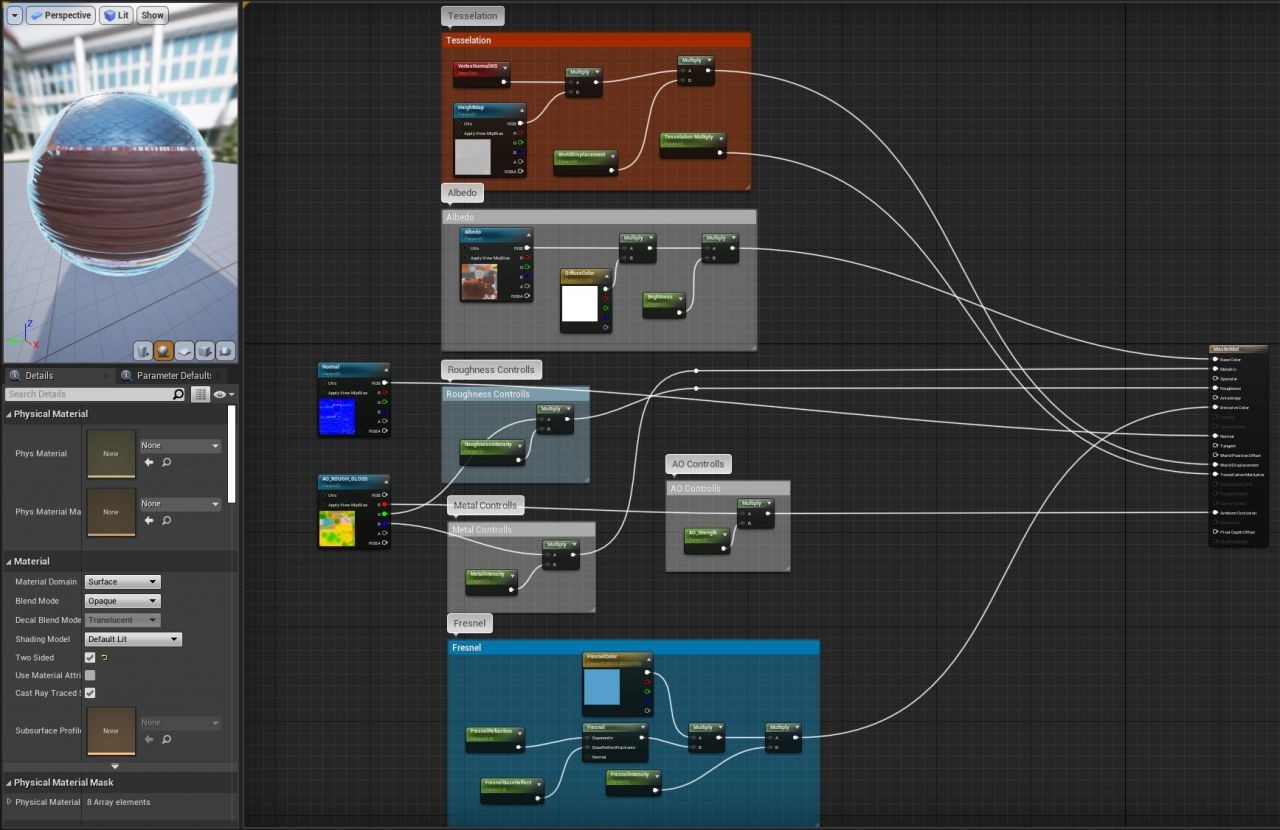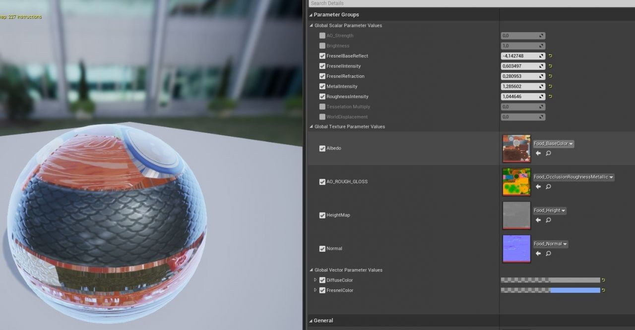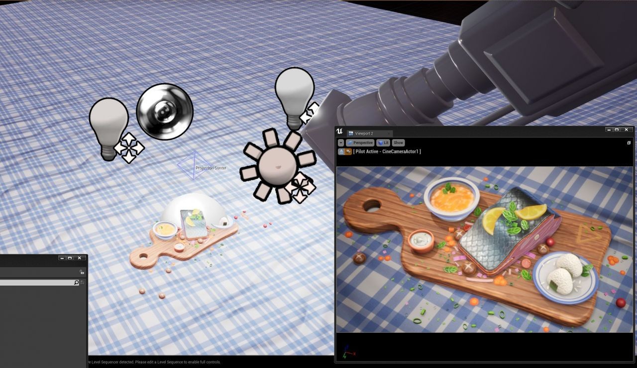 下一步將所有內容導入 Unreal Engine。為了盡可能地控制場景和顏色,我決定以 Base Material 和 Material 為實例。在主要材質中,我創建了 Fresnel rim 效果,用於米飯材質的 Tessellation 以及幾個顏色值,讓我能隨時更改(圖 9、10)。最後,我打了經典的三點光源,包含讓畫面更溫暖的 HDRI 和一台靜態相機,並經過不同的後期處理,例如顏色分級,光暈和曝光(圖11)。