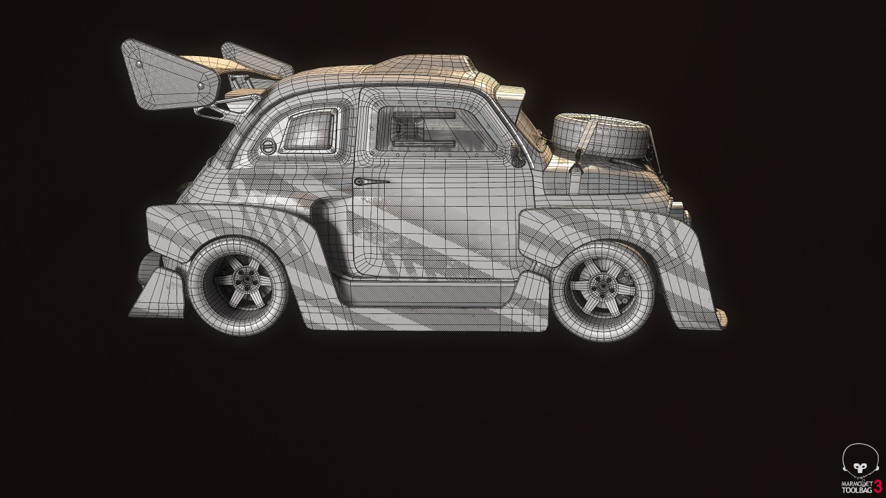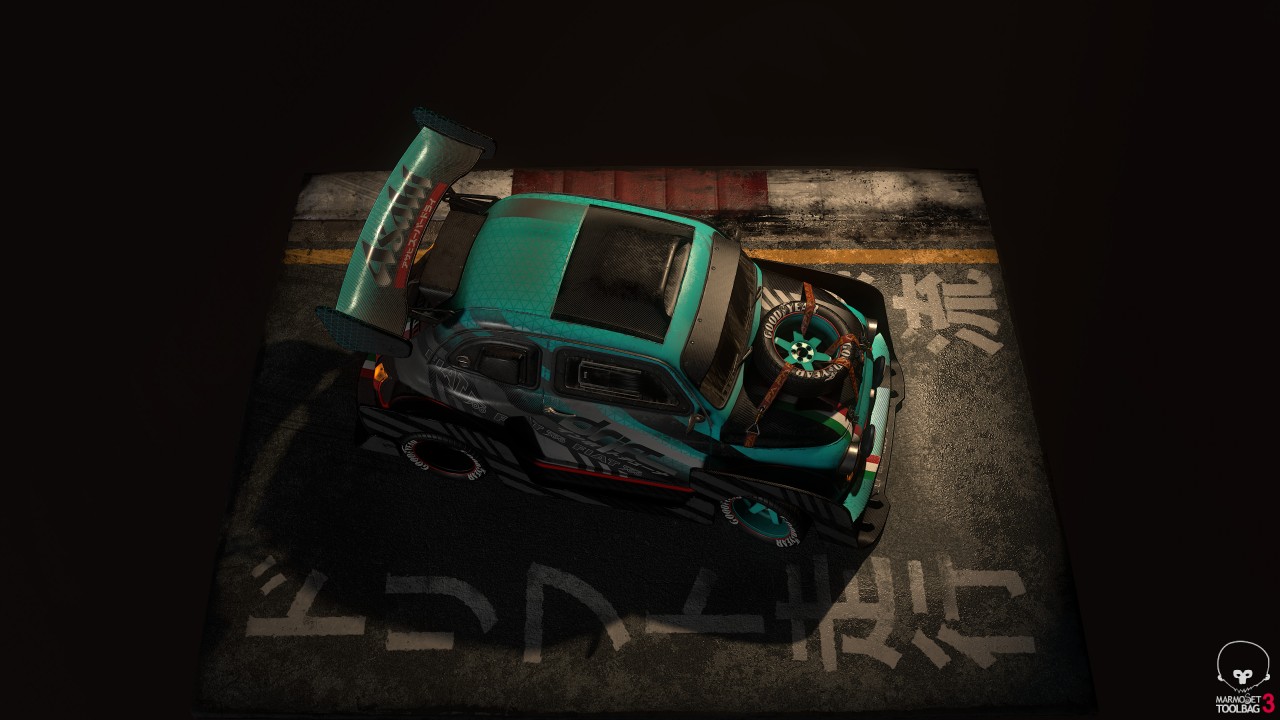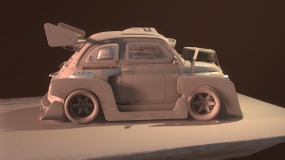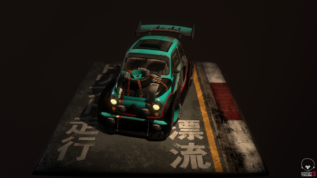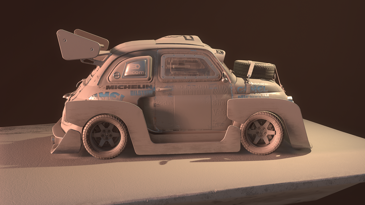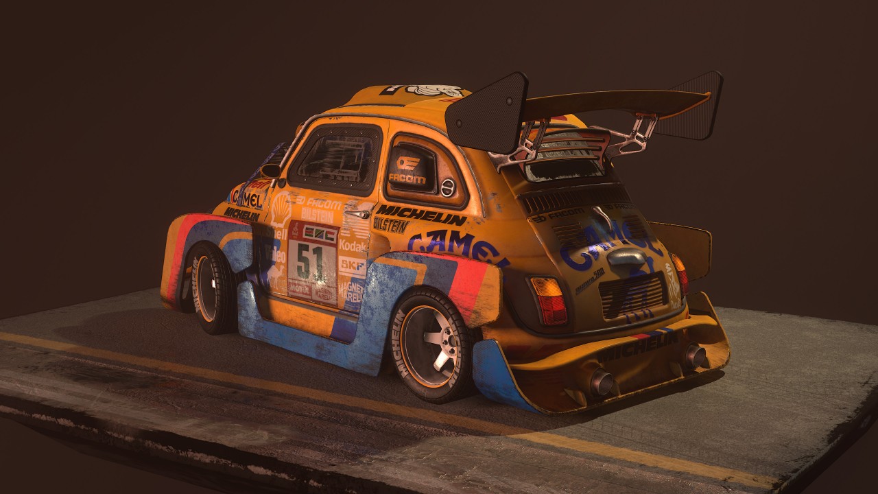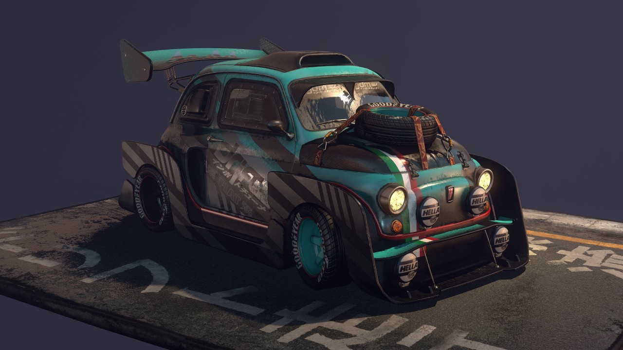 Marco Vergantini:1969 Fiat 500 L 是我的第一台車,我父母在我 18 歲的時候買給我的。即使它當時已經 40 歲了,我還是很享受和這台車相處的每分每秒,一直到最終我不得已必須將它賣了的那一刻都是如此。這甚至是我大學時第一個 3D 考試的題目!上個聖誕節我找到一個資料夾裝滿了我大學時的舊作業。那時候我還以為自己做得很好,十年後的現在我再回去看,才發現它真是個糟到不行的 3D 作品!所以這次我做了一台對得起我的老車的 Fiat 500 的模型,但一如往常的,我必須加上那種老舊、髒污和修補的痕跡在車身上。這個作品靈感大多來自於 Peugeot 205 T16 "Grand Raid" 1987 Paris Dakar 這款車。另一個作品 Sunset Drift 中的塗裝靈感則是來自於日本的賽車,我替整體車子的大包圍想了一種比較創新的做法,因為本來適合裝在 Fiat 500上的改裝零件,款式都有點太過老舊、太簡單,看起來不夠酷。