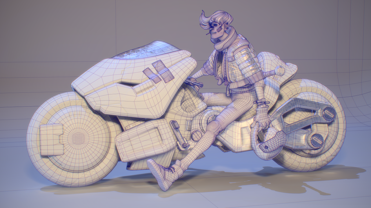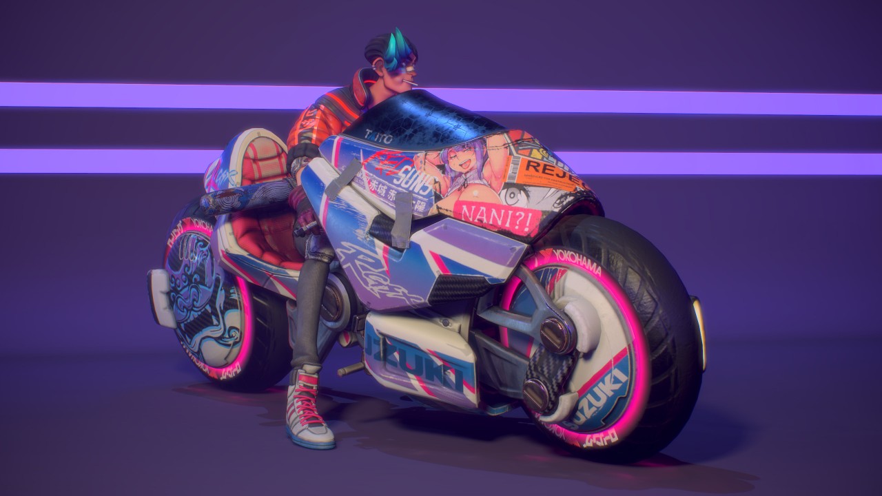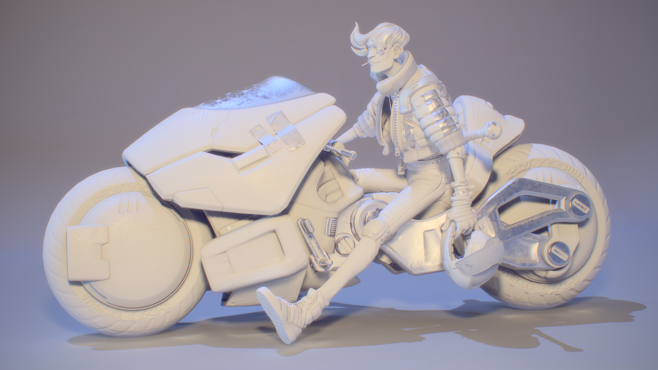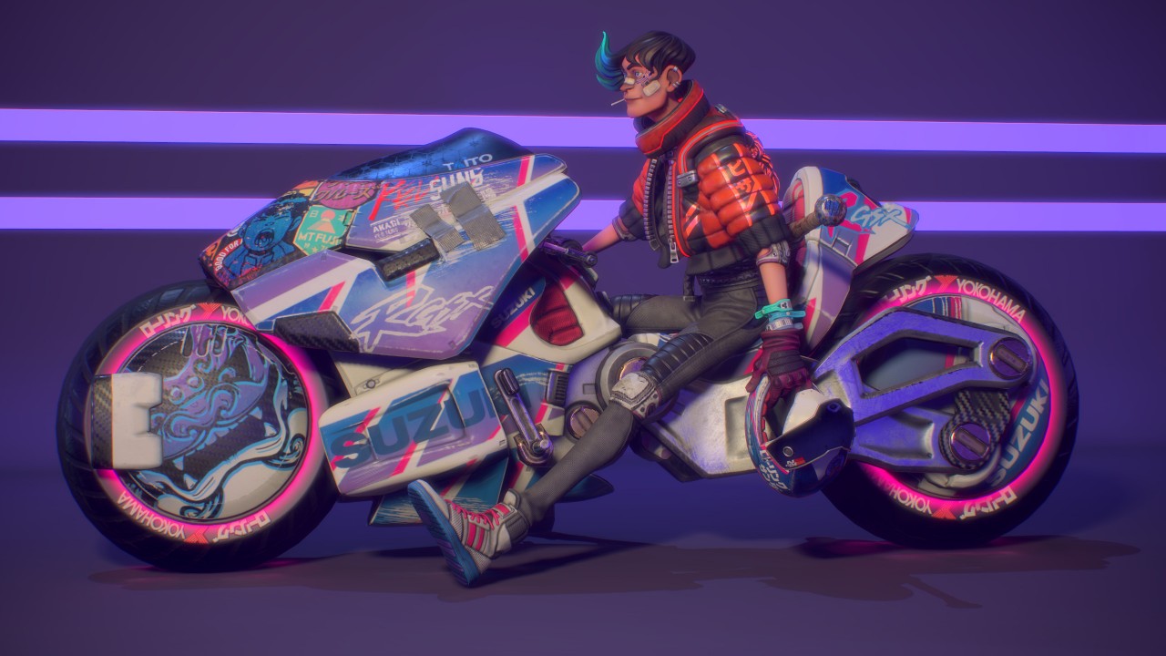 在我小的時候,我父親啟發了我對重機的熱情。最近我便有了想在平時空閒時間設計一輛帶有未來感的重機的想法,然而後來我又想,這個模型不該只是一輛重機,我應該要做的是一輛競速摩托車和騎士!為了讓風格一致,我將它們畫在同一張草圖上,我存檔時使用的檔名是「賽博龐克騎士」(Cyberpunk_Biker)。然後我開始構思這個角色的背景,他必須是一個暴走族的成員,還要有他們的暴走族 logo,要有一個可以對付另一個幫派的武器,還要有一些小細節來顯示他生活的不羈,例如醫院的住院手環,還有臉上的繃帶。考慮到這個摩托車也是角色的延伸,兩者必須看起來一樣的傷痕累累,所以車身上會有許多刮痕和大力膠帶。
