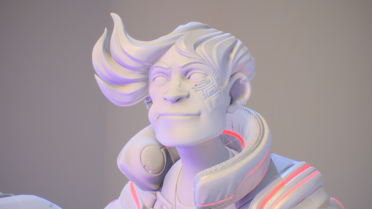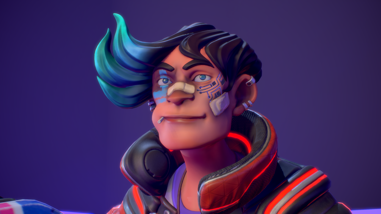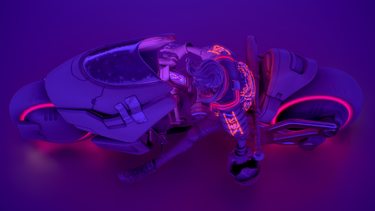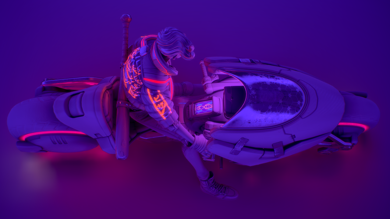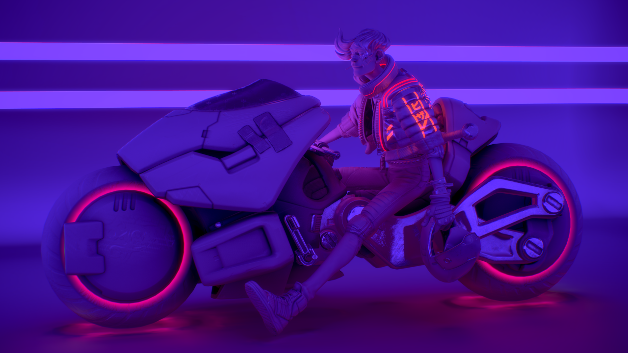 在我小的時候,我父親啟發了我對重機的熱情。最近我便有了想在平時空閒時間設計一輛帶有未來感的重機的想法,然而後來我又想,這個模型不該只是一輛重機,我應該要做的是一輛競速摩托車和騎士!為了讓風格一致,我將它們畫在同一張草圖上,我存檔時使用的檔名是「賽博龐克騎士」(Cyberpunk_Biker)。然後我開始構思這個角色的背景,他必須是一個暴走族的成員,還要有他們的暴走族 logo,要有一個可以對付另一個幫派的武器,還要有一些小細節來顯示他生活的不羈,例如醫院的住院手環,還有臉上的繃帶。考慮到這個摩托車也是角色的延伸,兩者必須看起來一樣的傷痕累累,所以車身上會有許多刮痕和大力膠帶。