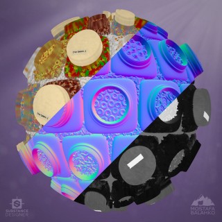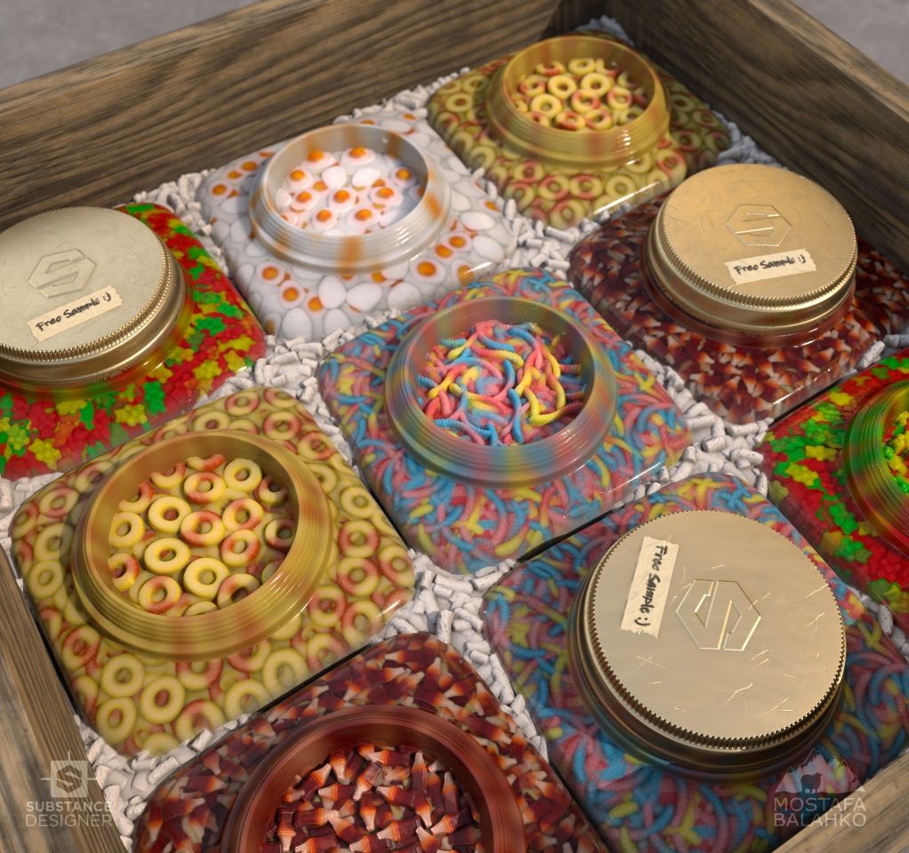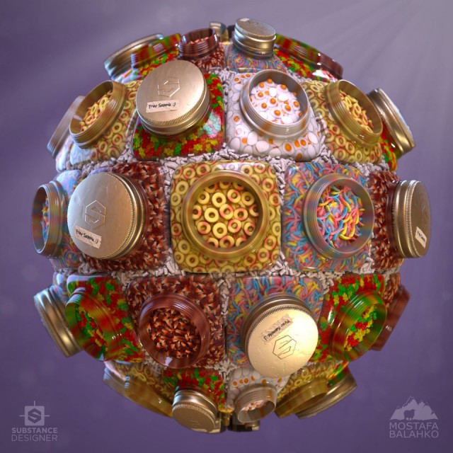 Mostafa:為了學習 Substance Designer 中的「subgraphs」功能,讓材質變得更加有深度,並應用於未來的專案,才決定打造《甜蜜衝擊》這個作品。有了概念後,就立即蒐集參考資料以及糖果圖像,為每個糖果類型製作材質。將糖果散佈後,我注意到圖案太密集,讓人感到不適,於是在其他藝術家的建議下,製作了糖果罐,讓作品看起來更整齊且完整。