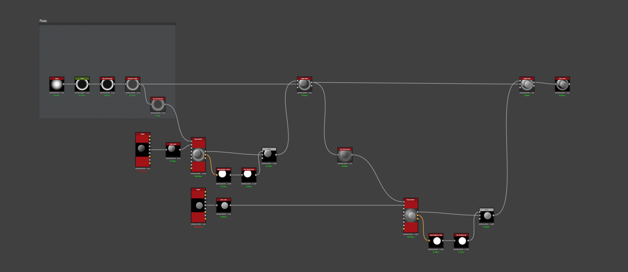 Mostafa:當時希望用《鬆餅早餐》,學習更多有機物的材質製作,像是鬆餅、水果、木桌、盤子等,甚至是糖漿液體製作。而我將這些元素組合起來,讓圖層相互堆疊,以鬆餅和盤子的堆疊來說,我使用 Substance Painter 中的「Shape splatter」節點,因為它有「conform to background」的功能,這很有用。可以把一些元素彼此疊合在一起。而我很喜歡鬆餅圖樣1的造形,然後將盤子連結到「Blur」節點,然後再連結到Shape Splatter作為背景高度,接著,我設定「conform to background」的值為 1,「Smooth Conform to background」的值為 2,使用 Shape Splatter 作為遮罩,從模糊的盤子中擷取出鬆餅,然後使用「Height blend」節點,將它與原始的盤子連結,如此一來,我可以自行調整數值,來看哪種效果最適合,並且對第二個鬆餅也是相同作法。
