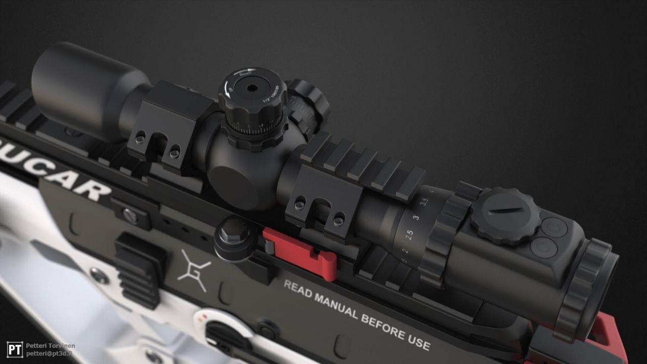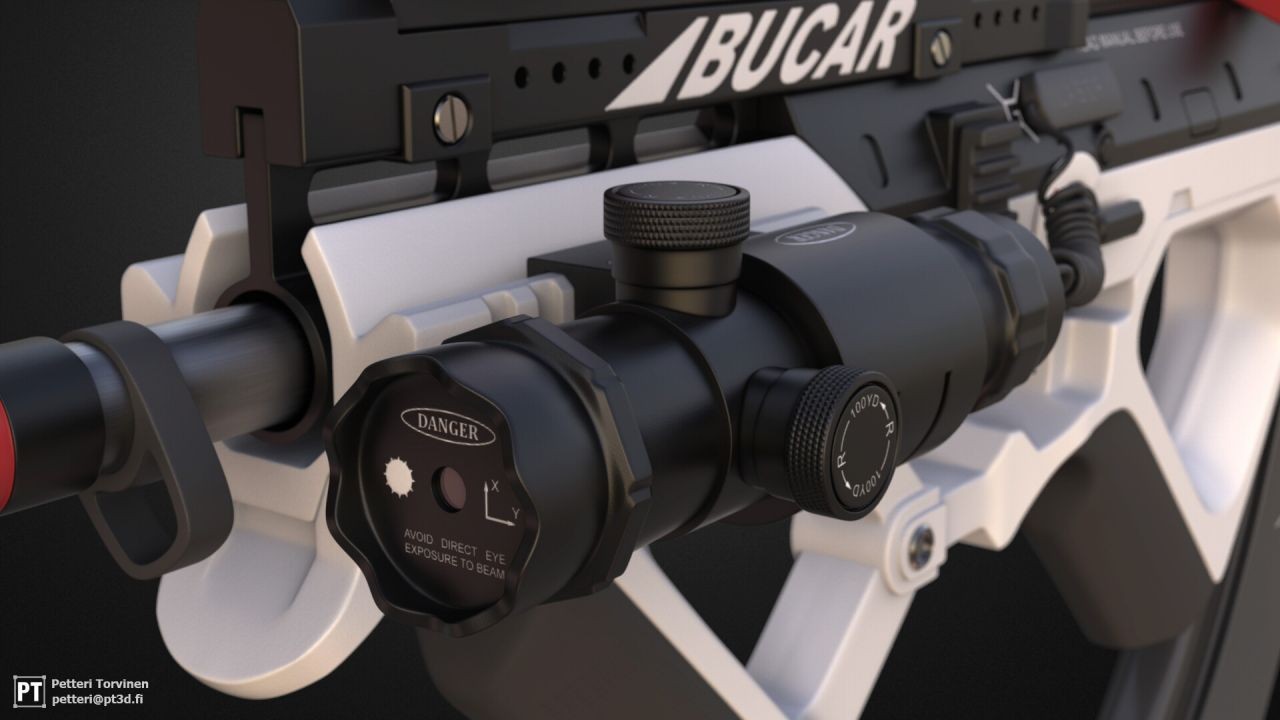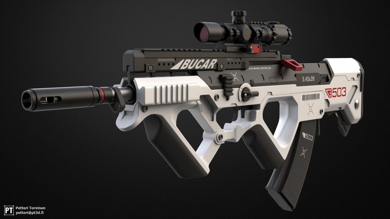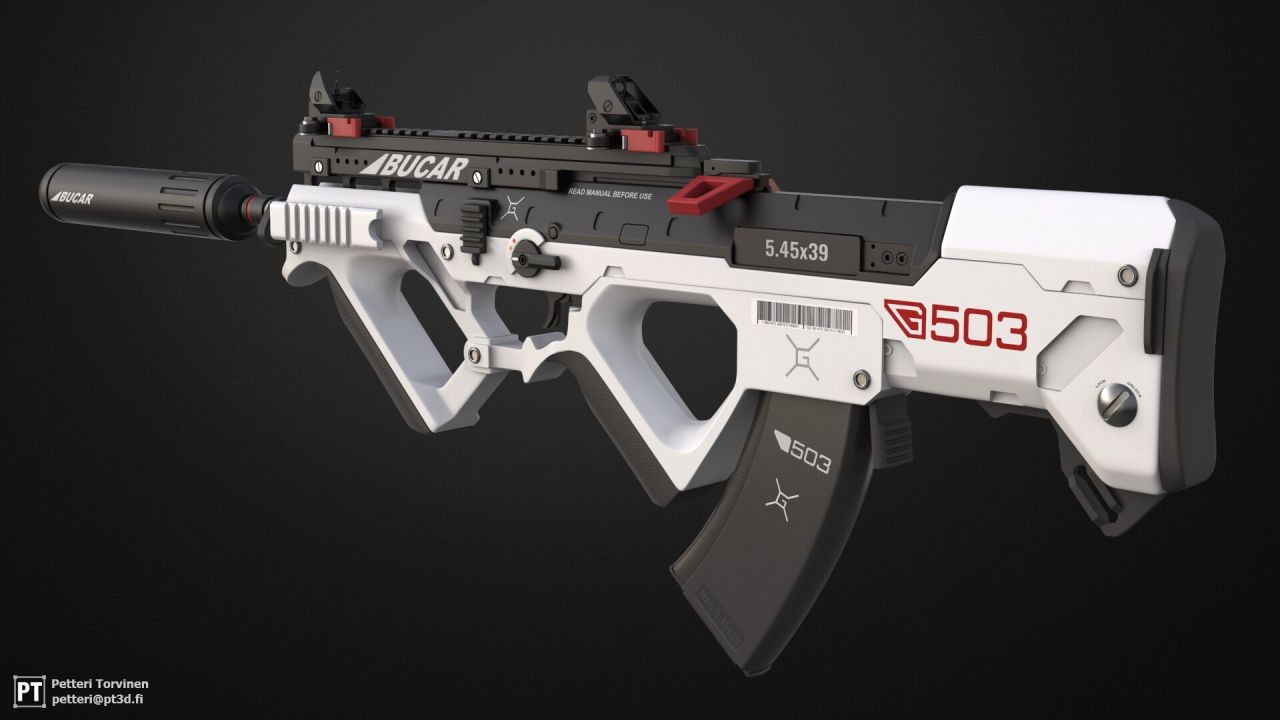 我選擇了 Kris Thaler 的 Bucar G503 ,我認為這個作品非常優秀,且激發我的靈感。這個作品有很多的細節,但也不會多到無法如期做完。除了將這個概念做成模型之外,我們也被要求需要做一些微調,所以最後我替它加上了狙擊鏡、消音器和雷射。
