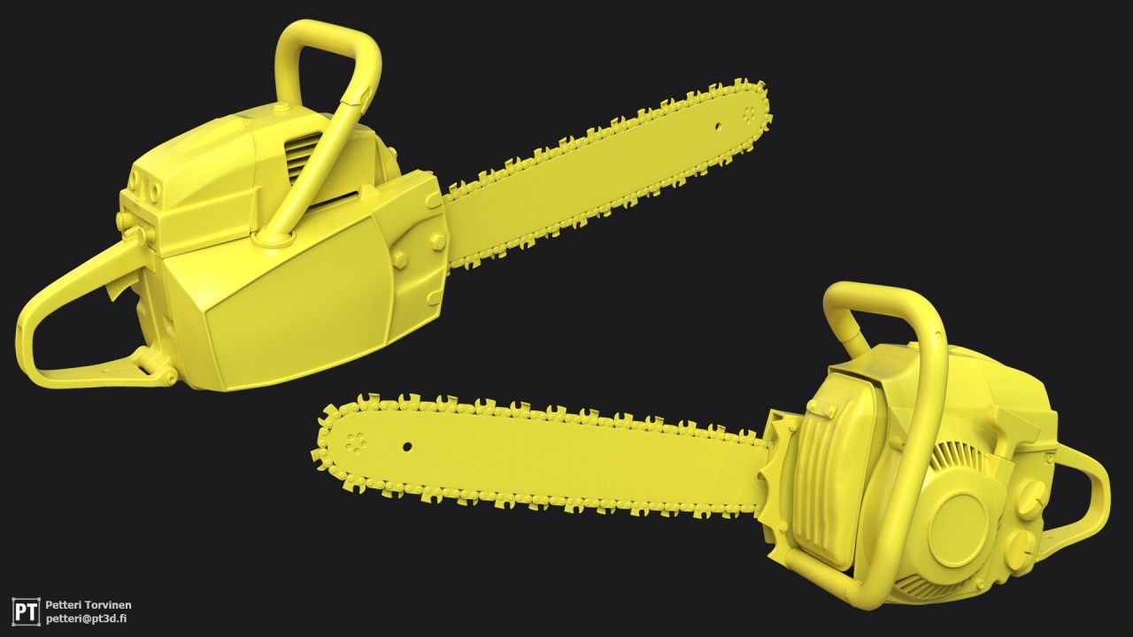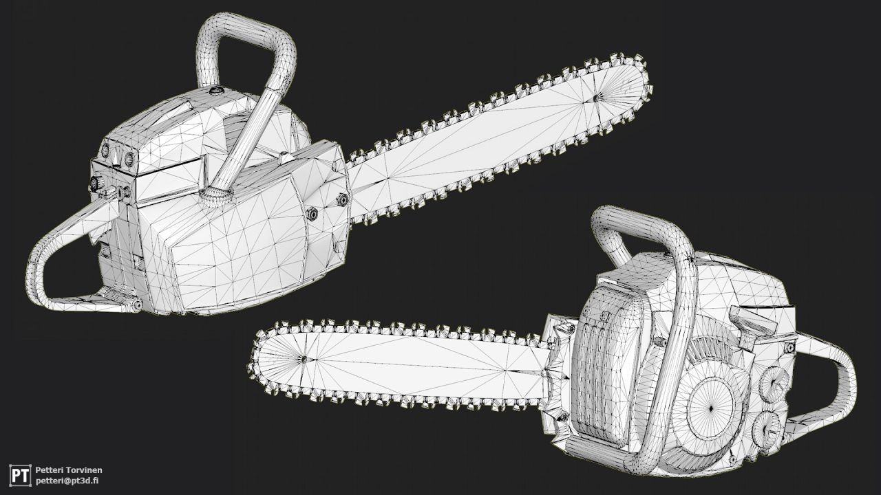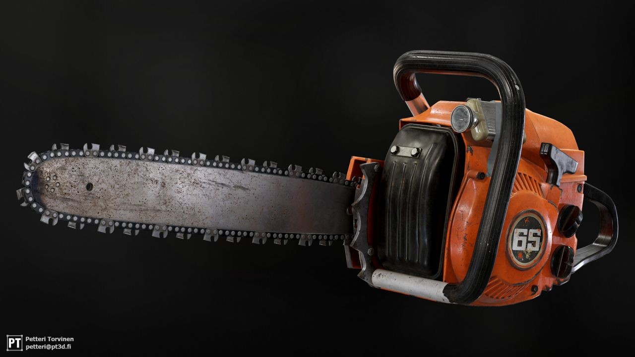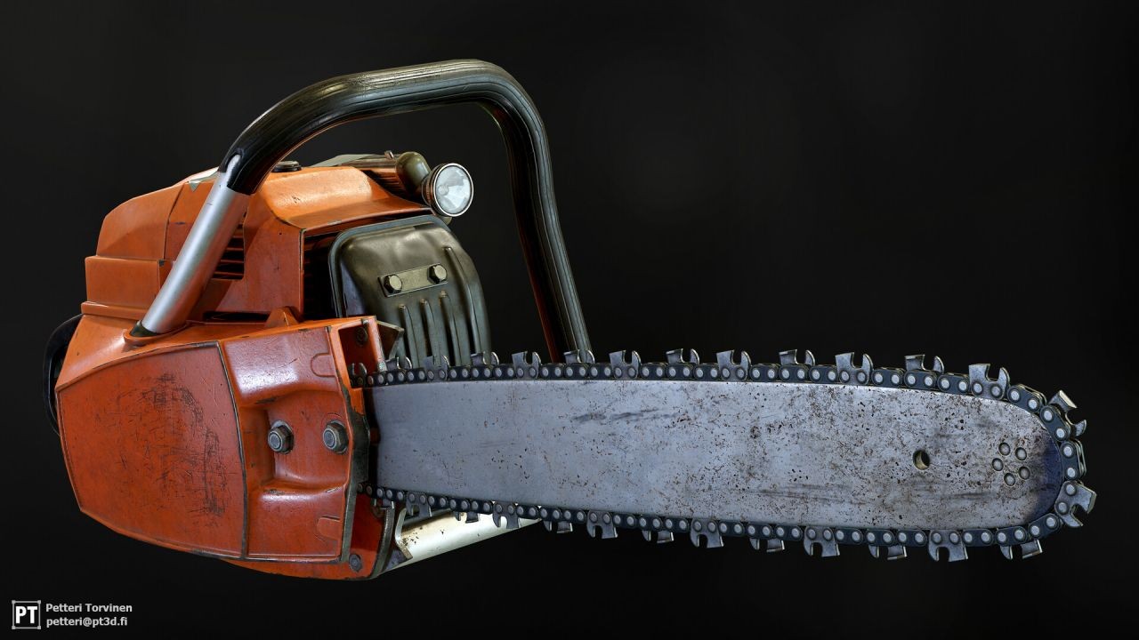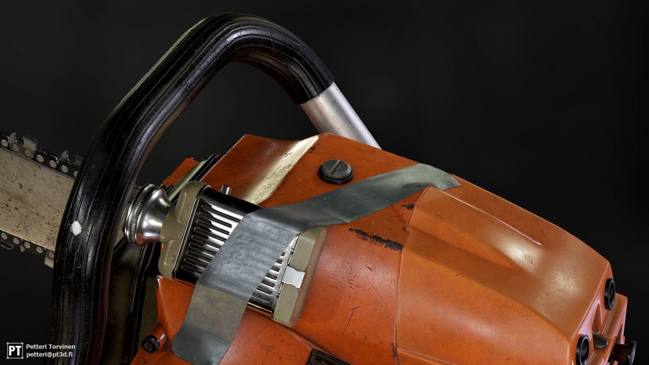 Petteri Torvinen:《鏈鋸》是我最近期的作品,在這之前我也曾經做過一些類似的遊戲模型,然而我認為是時候該嘗試製作更複雜一點的東西了。我一直都很喜歡《毀滅戰士 (Doom) 》系列遊戲,以及遊戲中出現的鏈鋸,當我在 Artstation 尋找的時候,並沒有看到很多高品質的電鋸作品可以放在遊戲中使用,所以我就決定嘗試看看。我以 Husqvarna 一款已經 45 歲的強大鏈鋸作為原型,並幫它額外加上本來沒有的手電筒以增添它的「角色特性」。