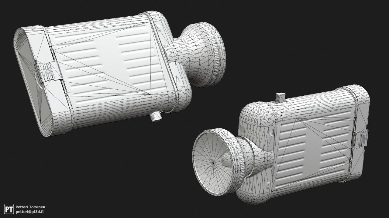 Petteri Torvinen:我認為這個作品最困難的部分是佈局及貼圖的部分。在佈局的時候,我在掌握所有零件的正確比例上遇到了一些小困難。貼圖對我而言困難在於我從沒有做過帶有這麼多磨損的物件。雕塑模型時最困難的地方則是啟動器,因為上面佈滿了小洞。同時,製作大力膠帶也意外的困難,我必須加上一些小技巧才能讓它看起來真實。