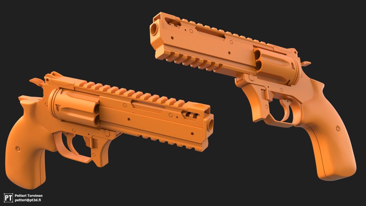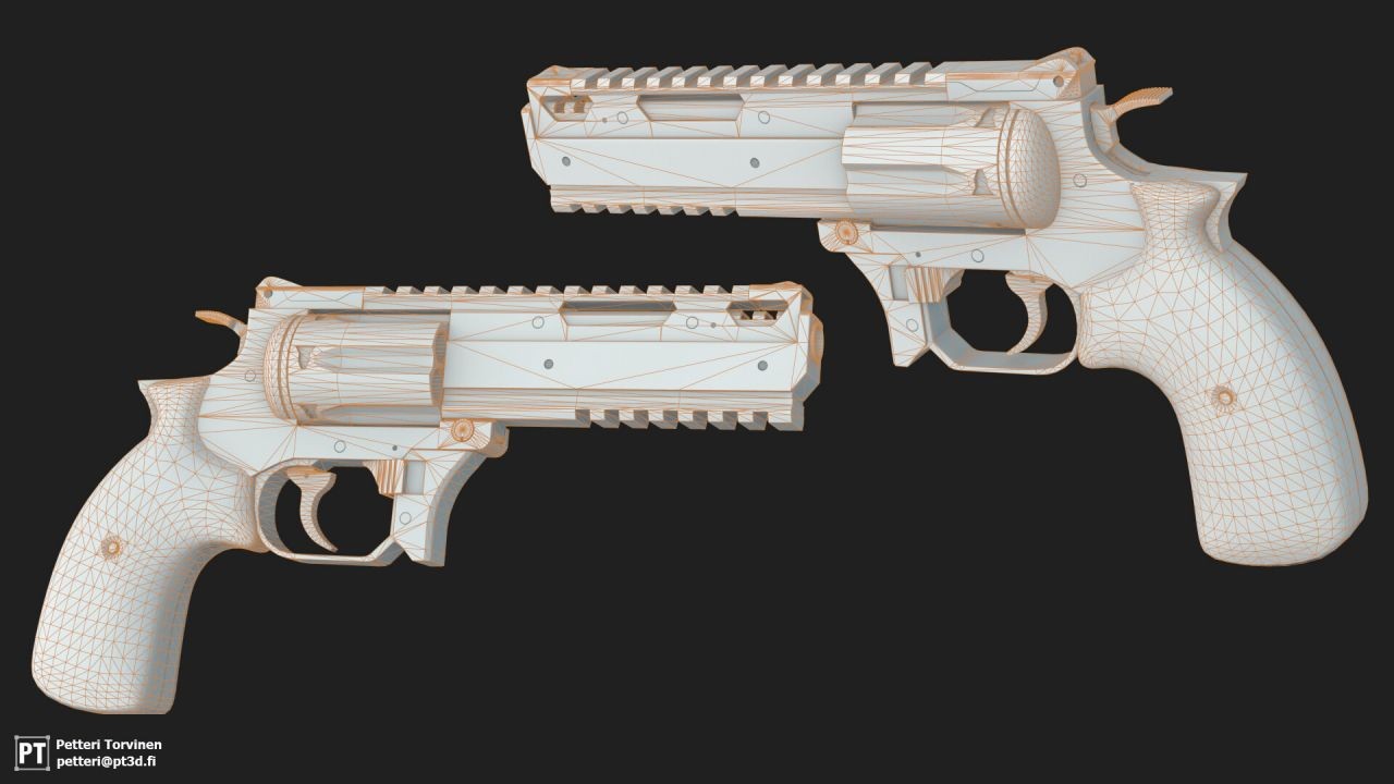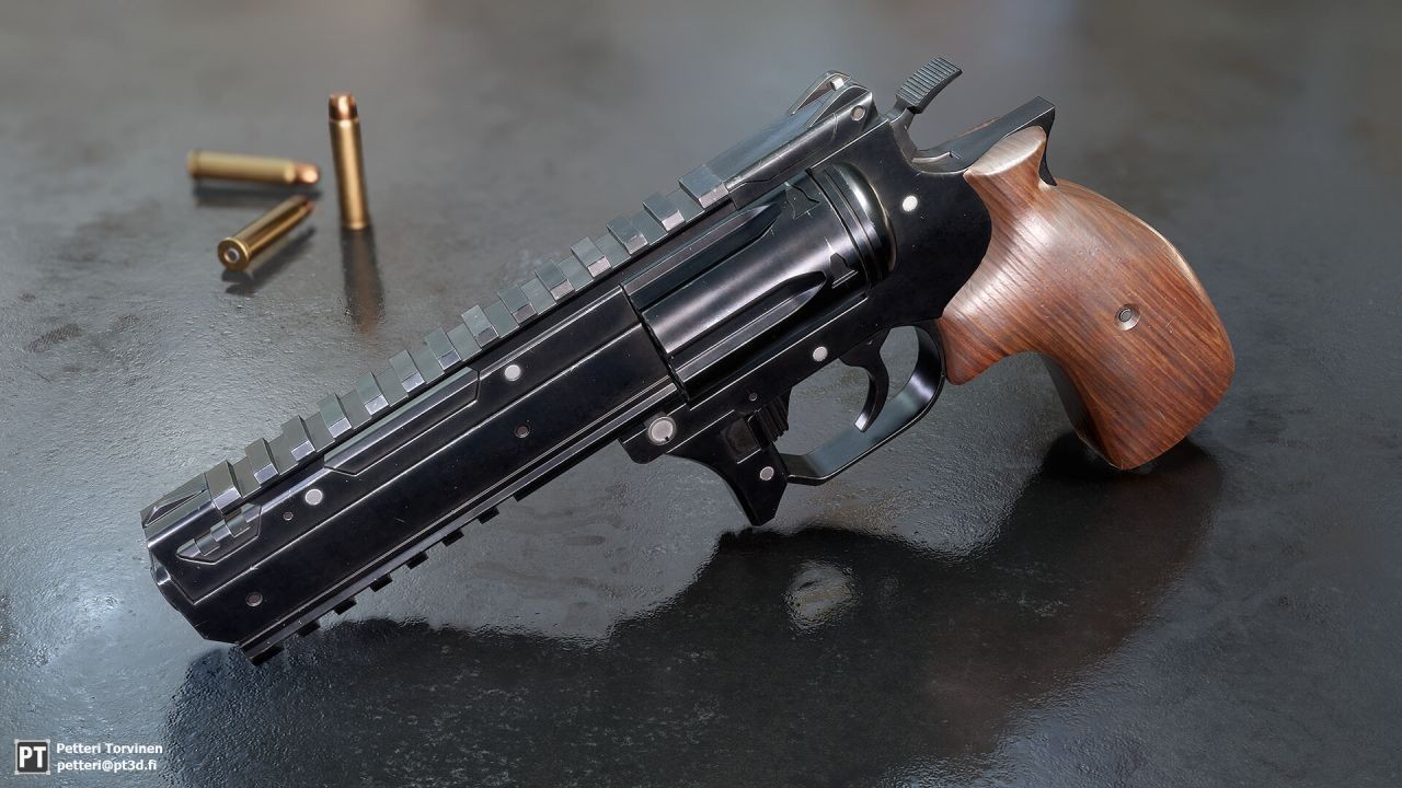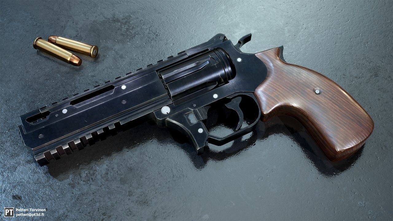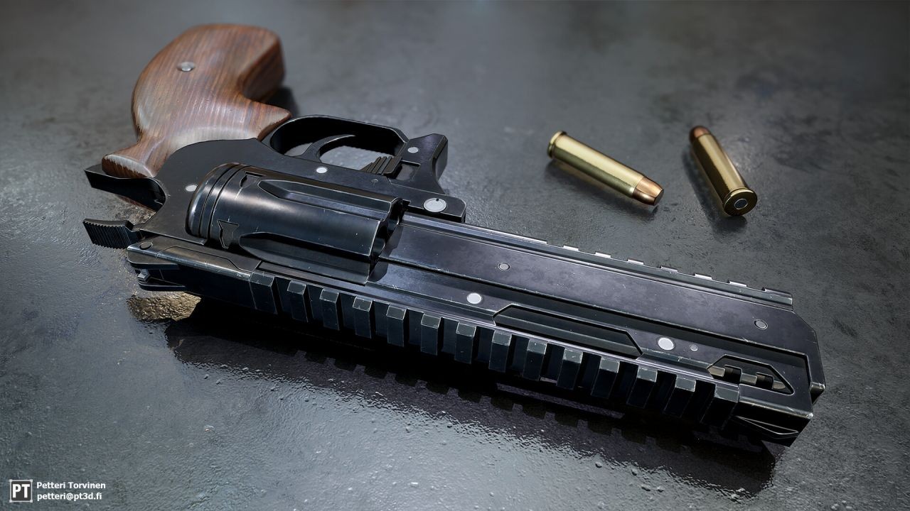 Petteri Torvinen:這隻左輪手槍是我第一個做的遊戲槍枝,它的原型是 Kris Thaler 的作品,但這個概念有些部分無法被做成 3D 模型,所以最後我只好稍微更改模型,並把材質換成黑色的金屬和木頭。工作流程和製作鏈鋸大同小異,收集參考圖、在 3ds Max中佈局和製作初步的高面數模型、在 ZBrush中完成部分區域的布林運算、再回到 3ds Max 降低面數、到 RizomUV 拆分 UV,在 Marmoset 烘焙貼圖和渲染,以及在 Substance Painter 中完成貼圖。