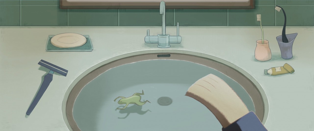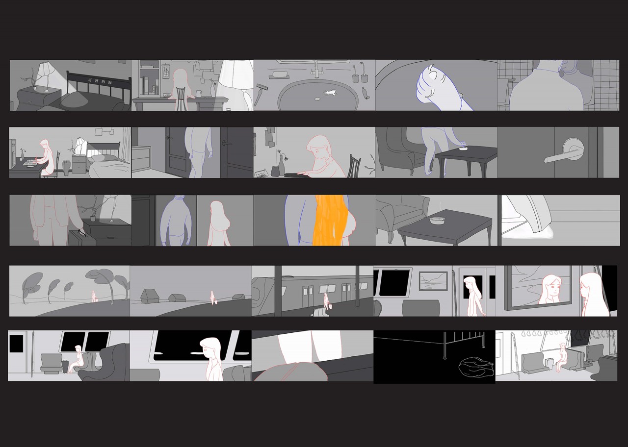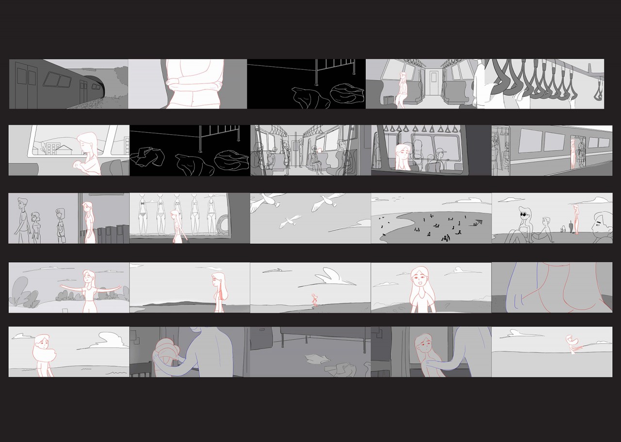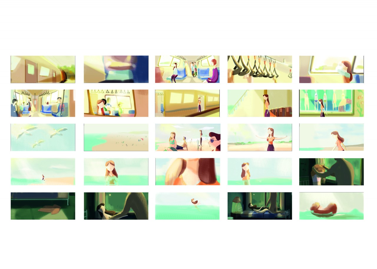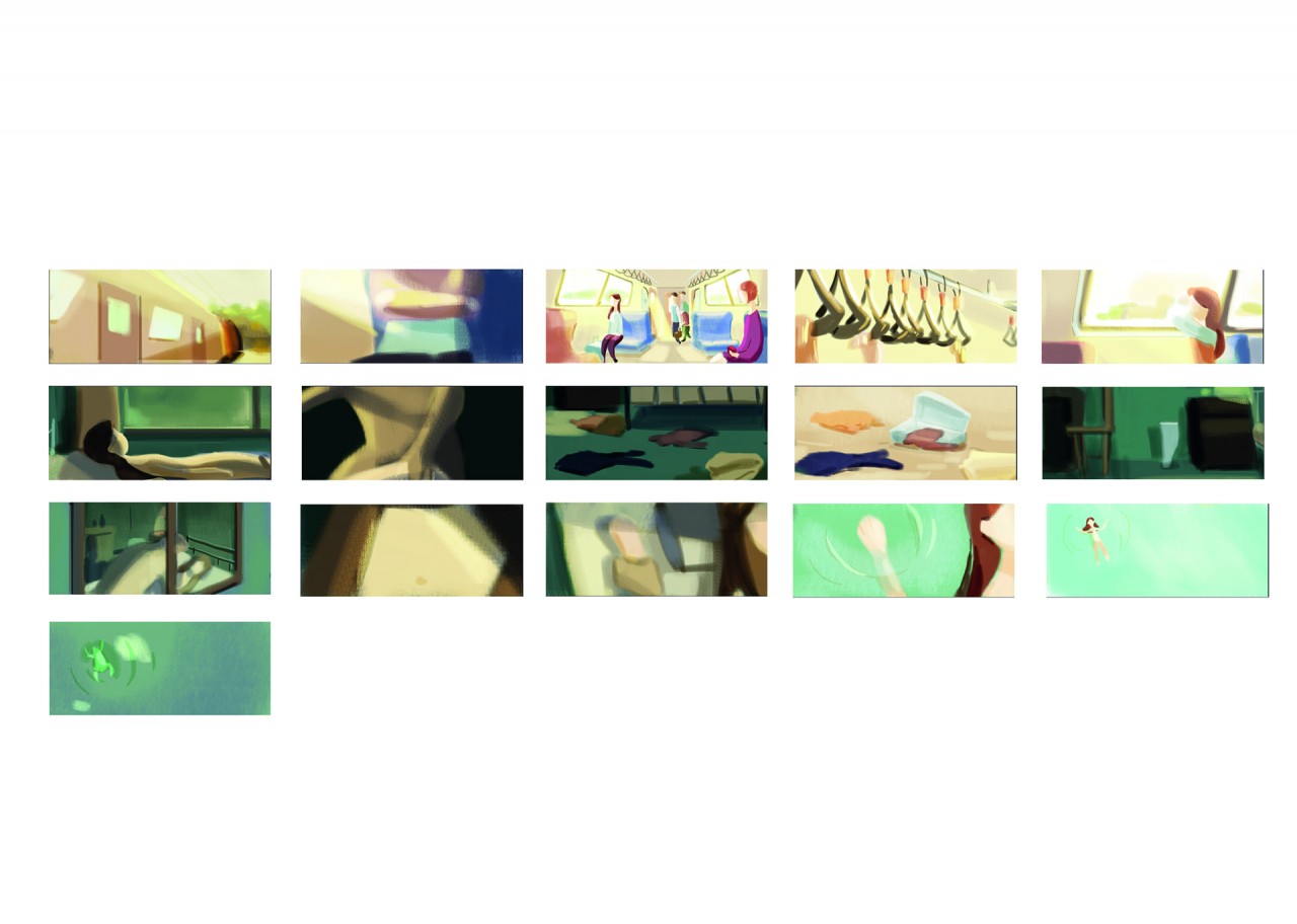 動畫一開始寒冷、狹小的空間給人一種孤獨、冷清的感覺,然後隨著火車行駛,女孩的靈魂逃離了令人窒息的家。我們想營造出一個女孩嚮往、與家裡環境截然不同的地方,於是讓女孩來到溫暖、開闊的海邊,使自己得到平靜。我們用青蛙作為女孩凍僵反應的比喻,最後爸爸的手抓住了青蛙,就像是抓住了女孩一樣。 另外商店櫥窗內的泳裝模特兒也反應了女孩的凍僵狀態,沒有華麗、活潑的氣息,沒有表情沒有動作,只是僵著。
